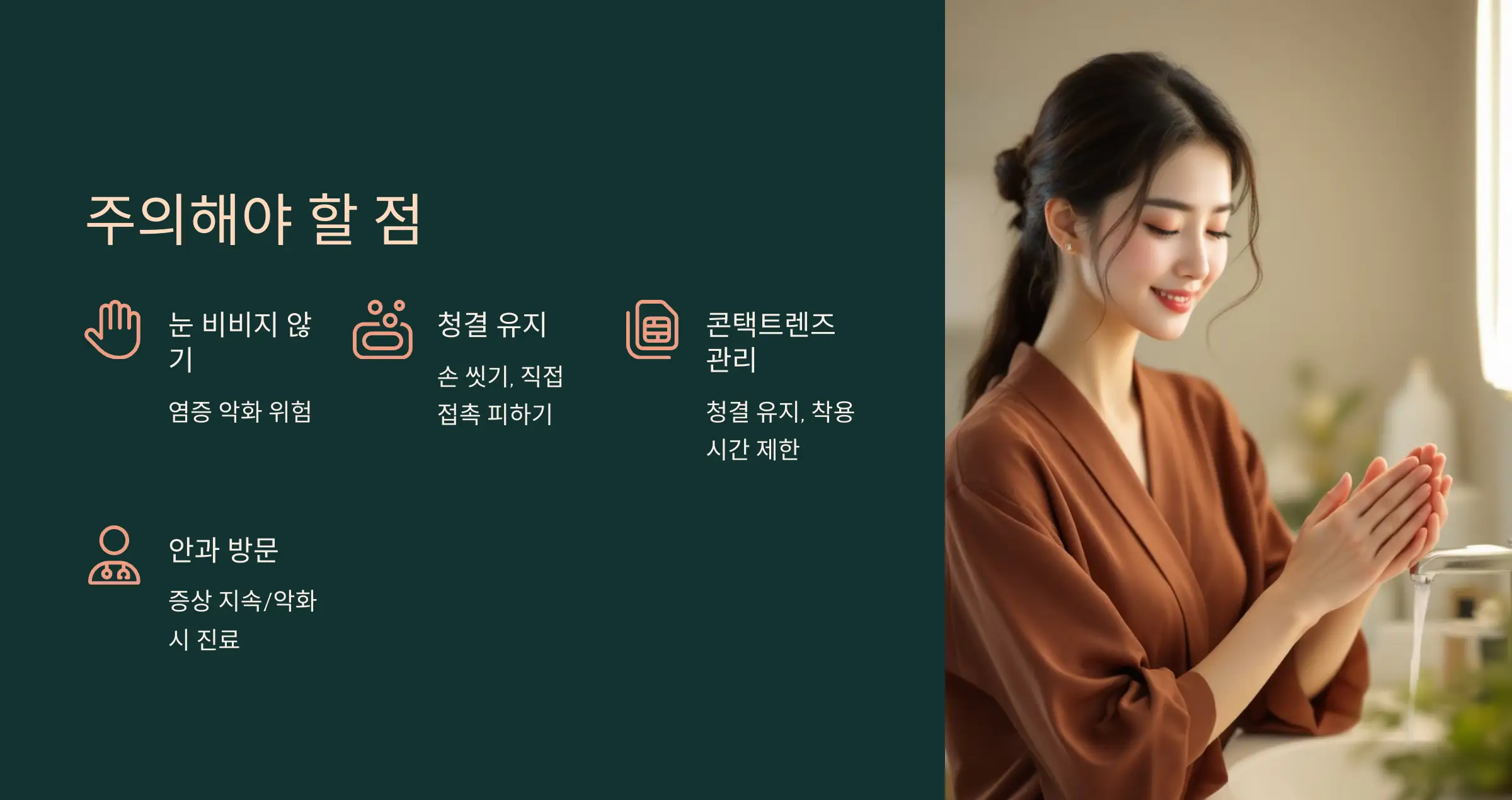 - 콘택트렌즈 관리: 렌즈를 청결하게 유지하고, 착용 시간을 제한합니다.