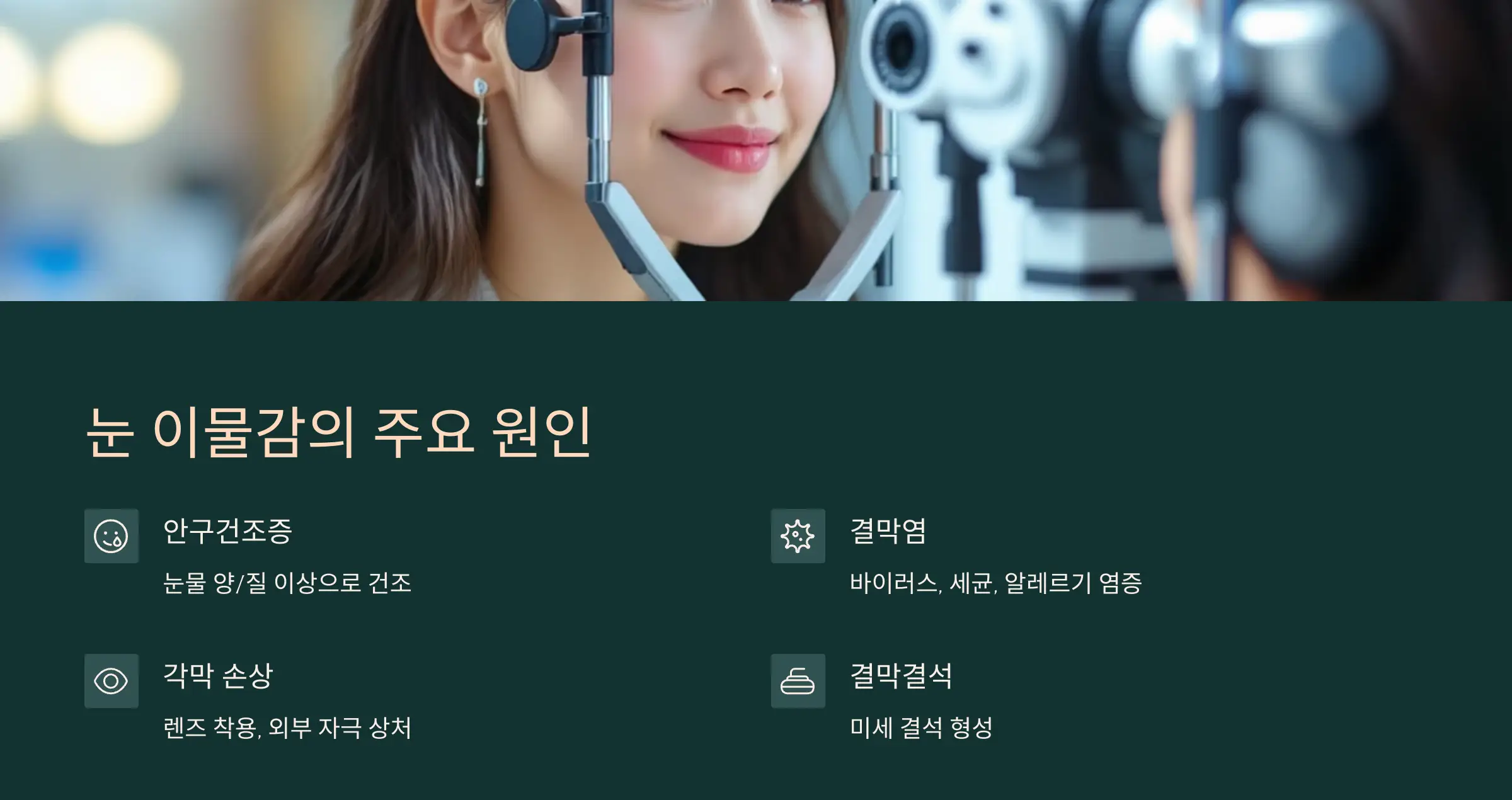 - 안구건조증: 인공눈물 점안, 눈꺼풀 청소, 환경 개선 등이 도움이 됩니다.