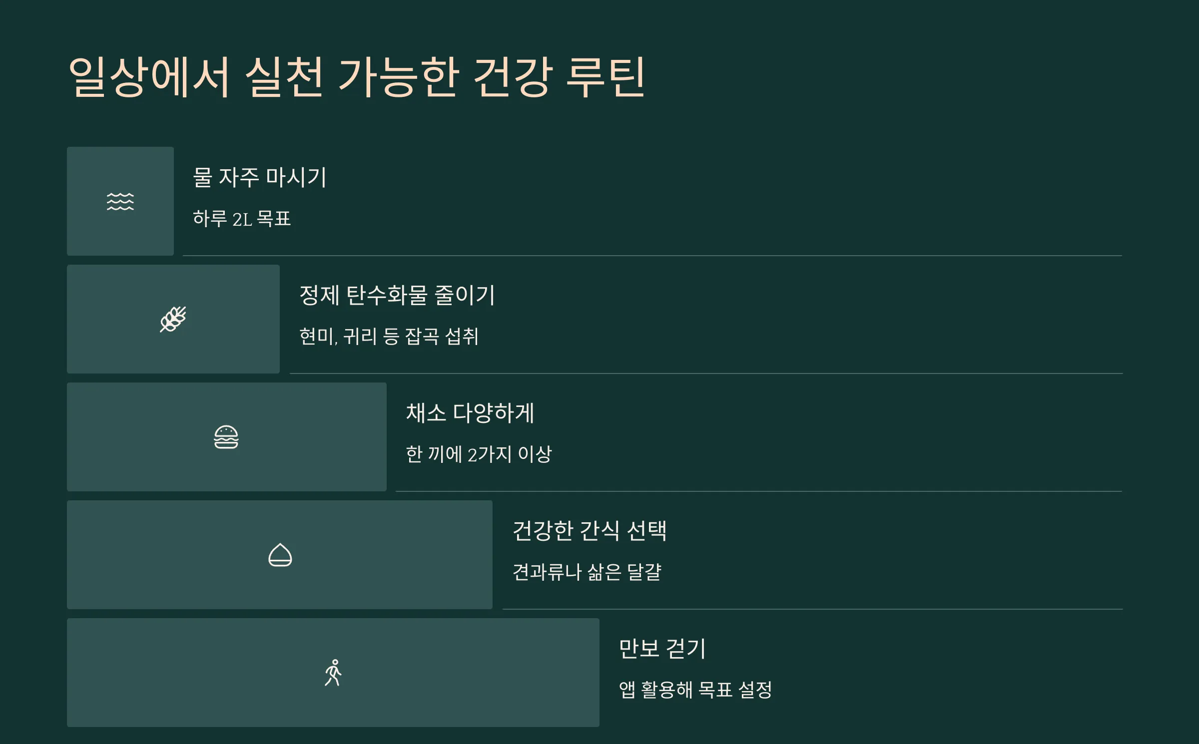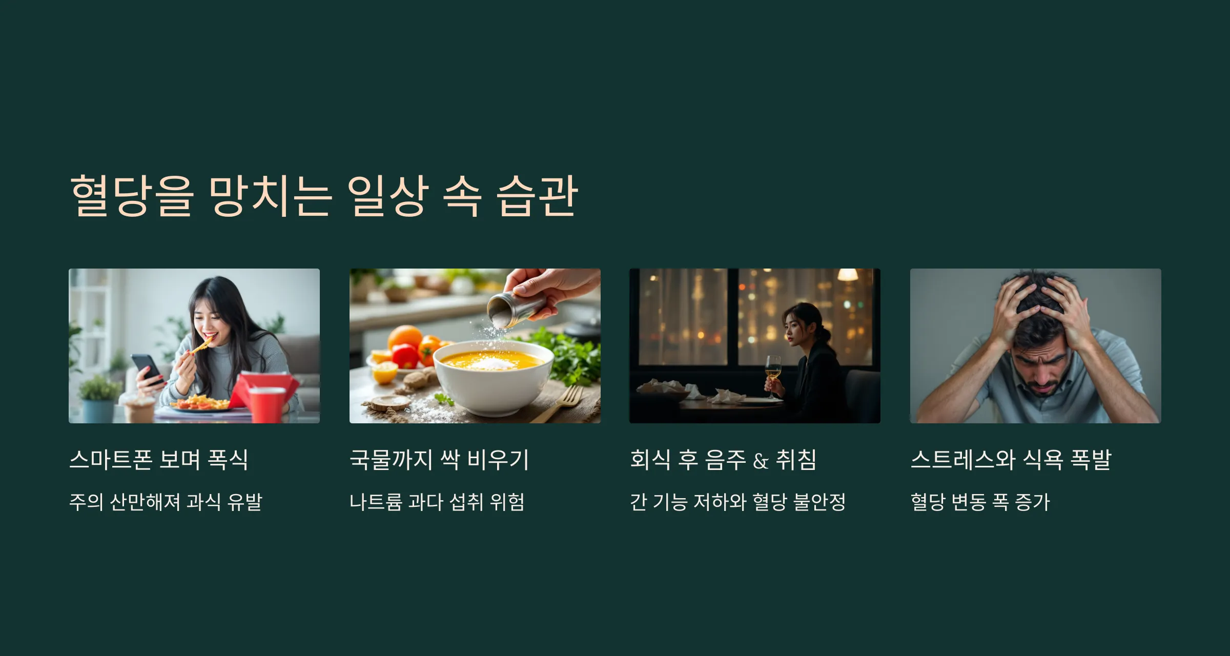 이런 습관들이 모여 혈당 변동 폭을 키우고, 인슐린 저항성을 악화시킵니다.