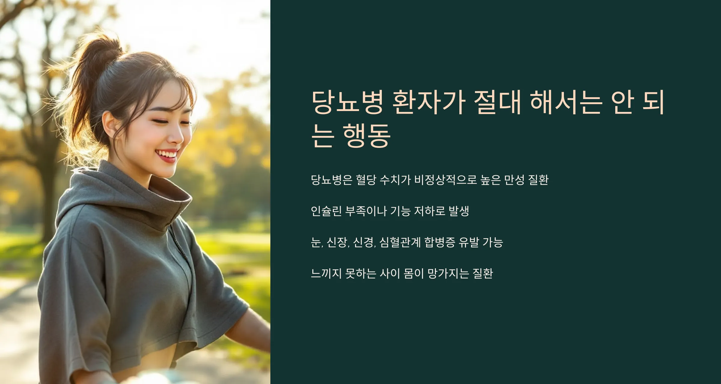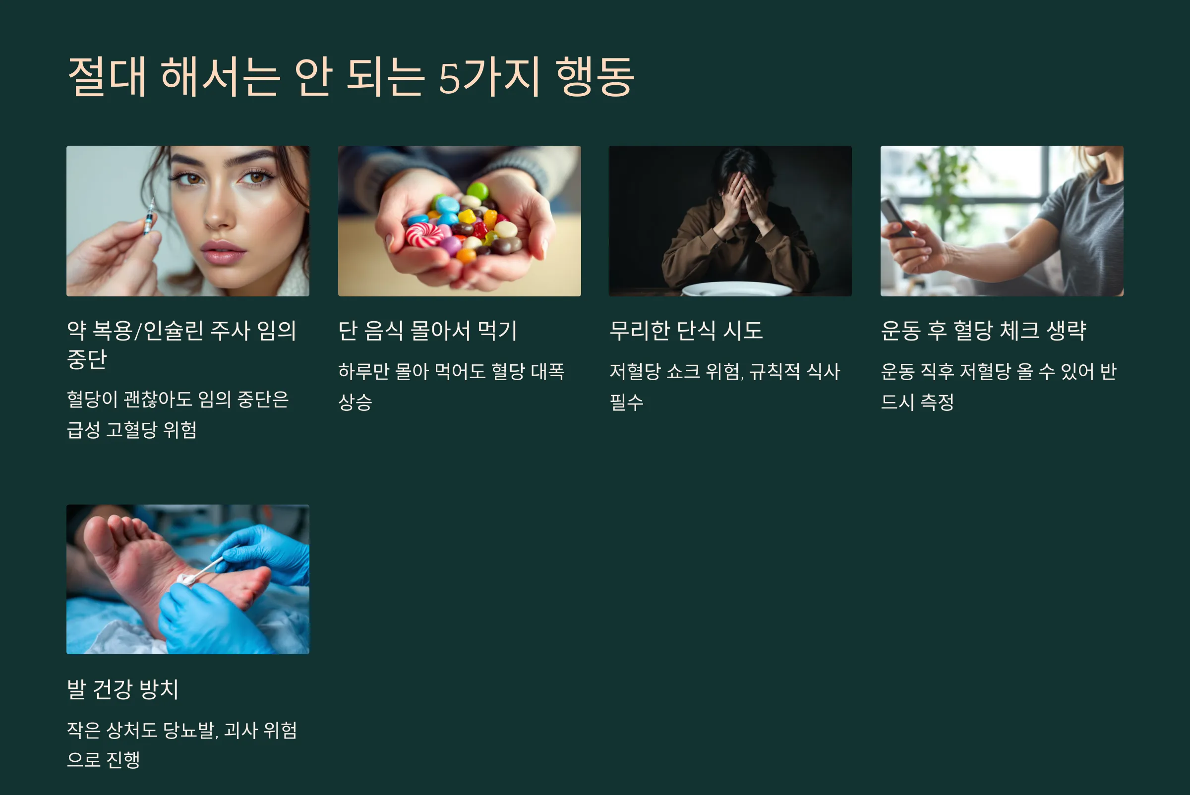 당뇨 환자가 절대 해서는 안 되는 행동을 정리하면 다음과 같습니다: