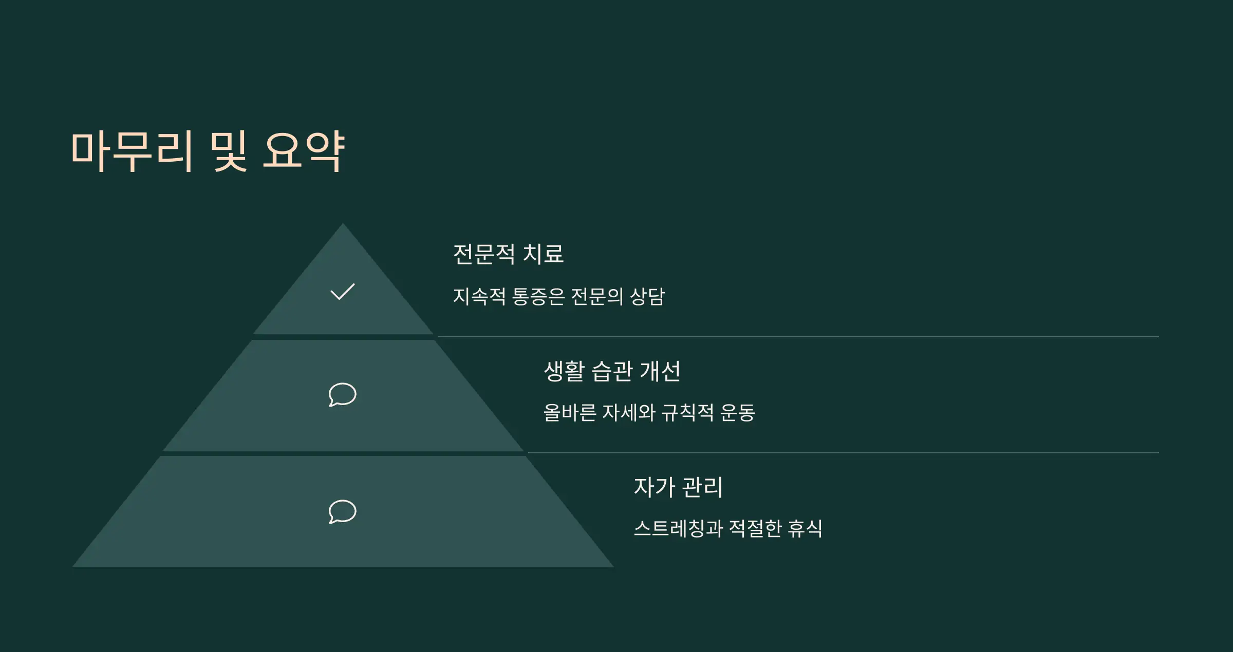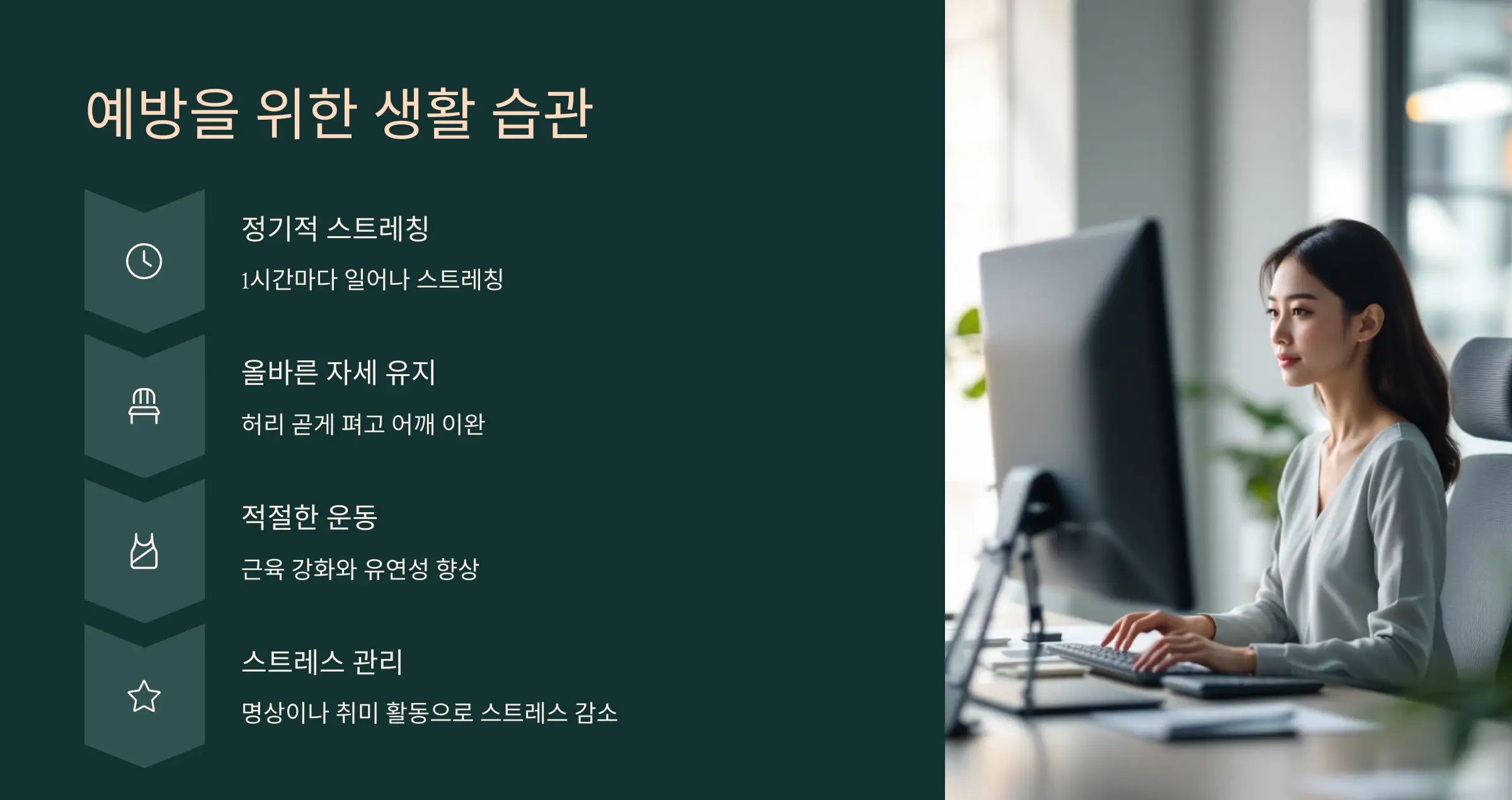 - 자세 교정: 올바른 자세를 유지하여 근육에 가해지는 부담을 줄이는 것이 중요합니다.