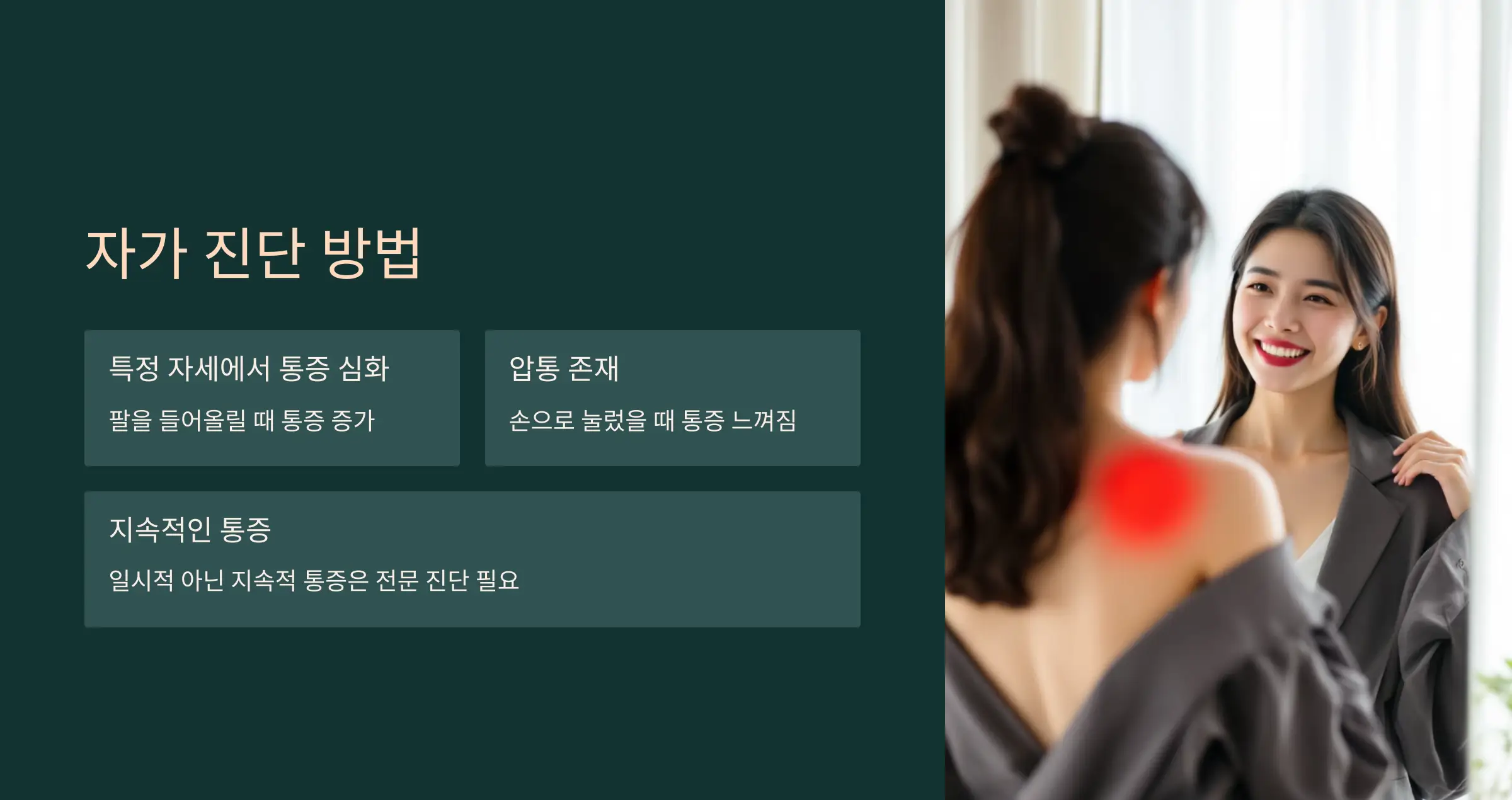 - 특정 자세에서 통증이 심해짐: 예를 들어, 팔을 들어올릴 때 통증이 증가한다면 근육 문제일 수 있습니다.