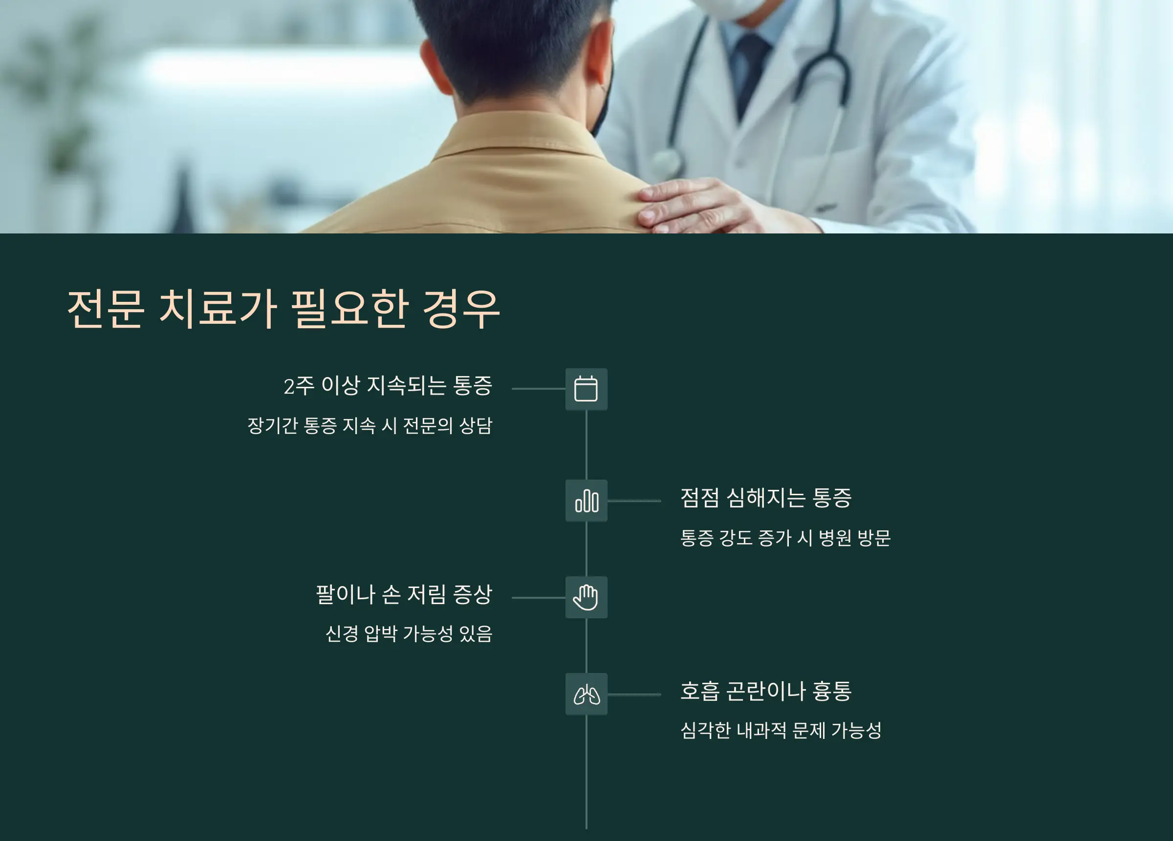 - 통증이 지속되거나 반복됨: 일시적인 통증이 아닌 지속적인 통증은 전문적인 진단이 필요합니다.