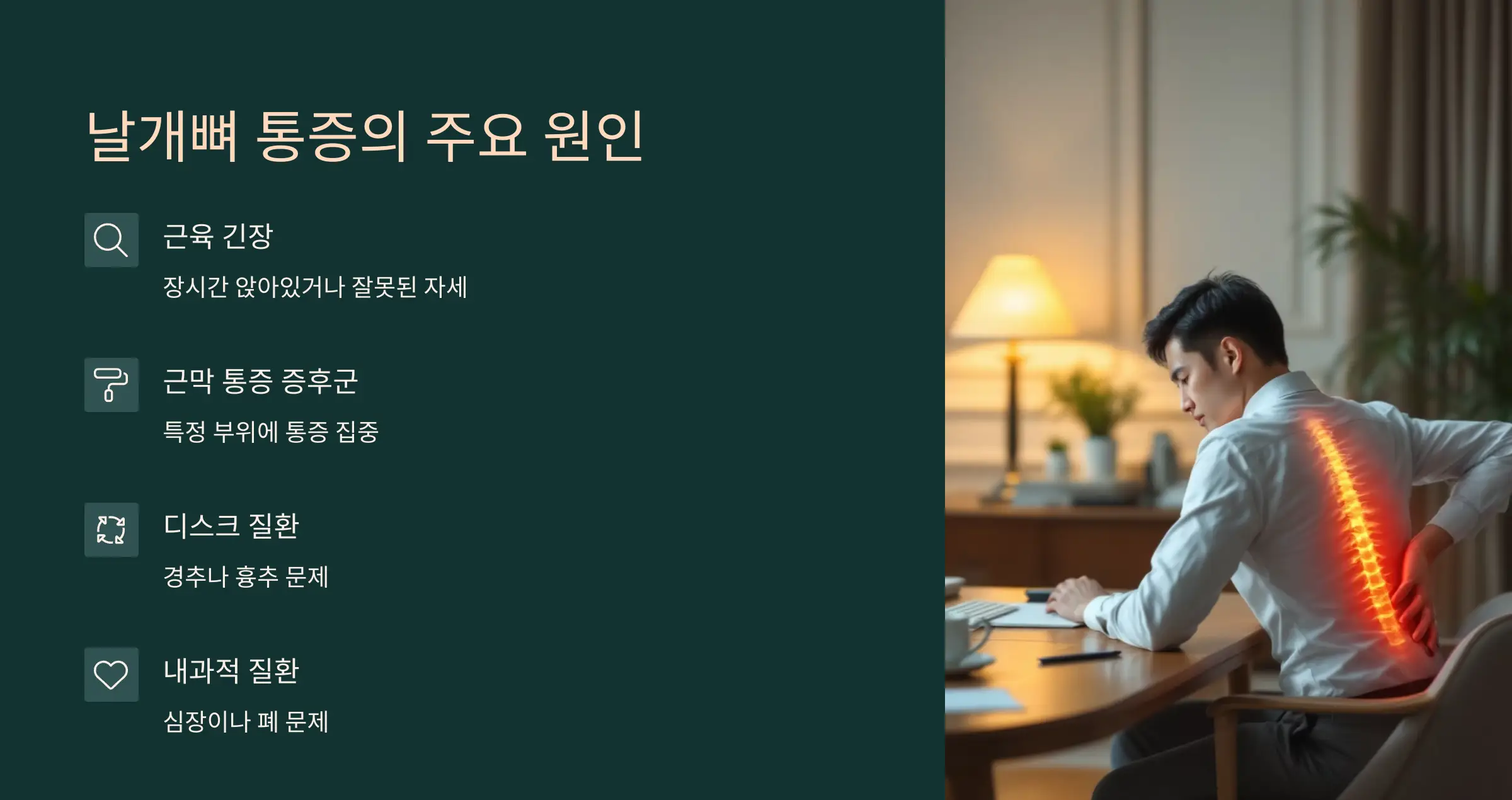 - 디스크 질환: 경추나 흉추의 디스크 문제가 날개뼈 부근에 통증을 유발할 수 있습니다.