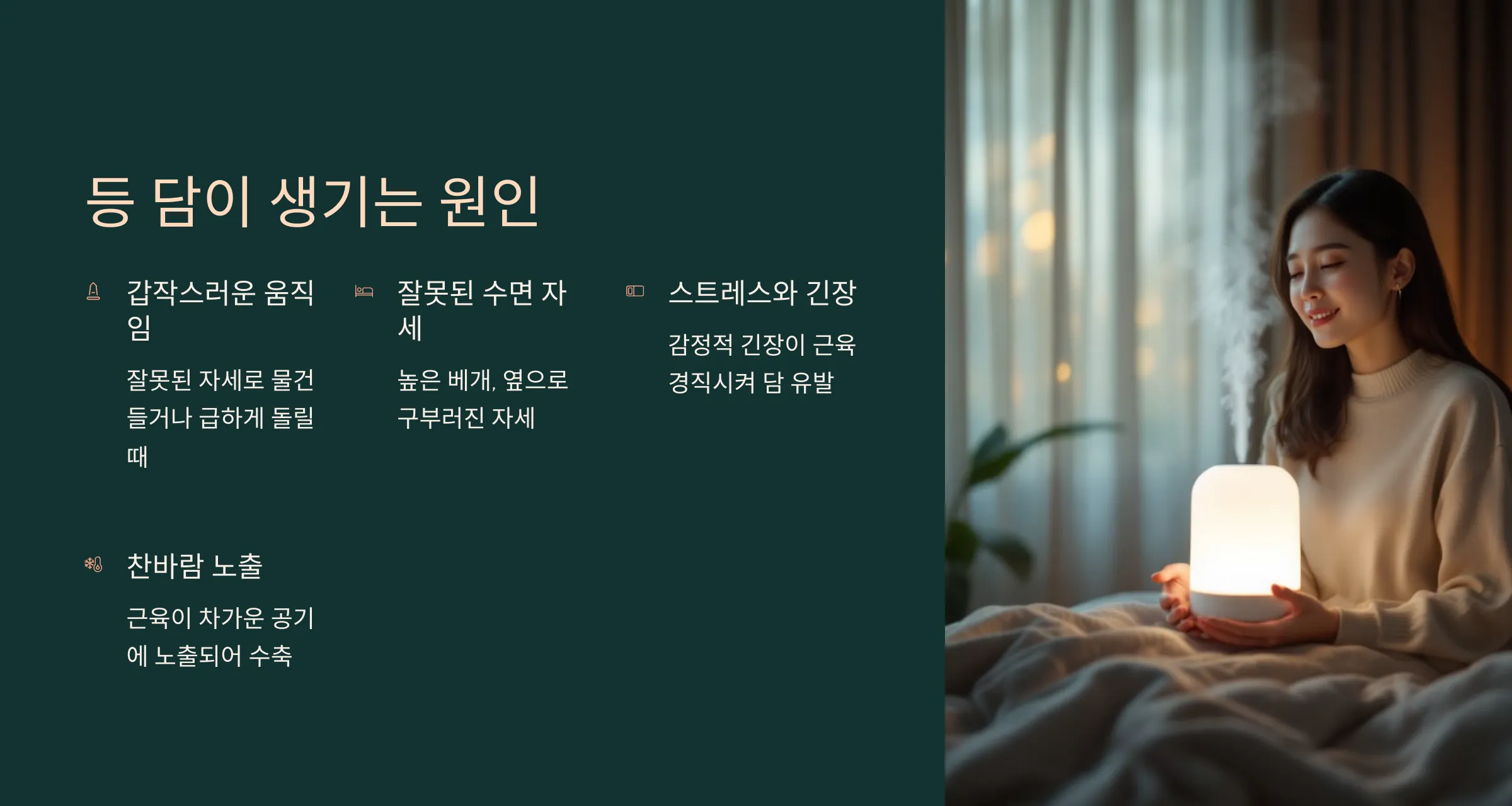 ✔ 등 담은 누구나 경험할 수 있지만, 정확한 스트레칭과 생활습관만 잘 지켜도 예방과 완화가 가능합니다!