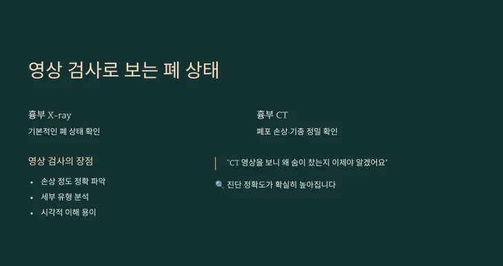 제가 직접 병원 설명을 들었을 때, CT 영상에서 검게 보이는 부분이 염증이나 폐포 손상 정도라고 하더라고요. 이런 시각 자료는 환자에게도 이해가 쉬워서 많은 분들이 “아 이제야 왜 숨이 찼는지 알겠다…”라며 놀라곤 해요. 🔍