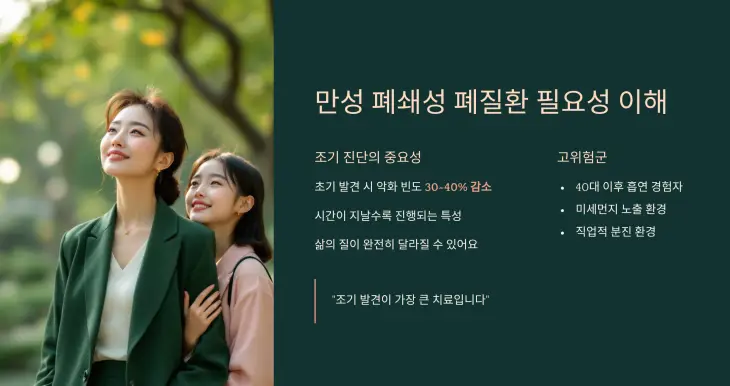 초기 증상만 잘 알아도 진단까지 훨씬 빠르고 수월하게 가더라고요. 제가 들었던 대표적인 초기 증상은 숨이 차는 느낌, 아침에 가래가 늘어난 느낌, 계단 오를 때 유독 숨이 가쁜 상태 등이 있어요. 이런 증상이 반복되면 꼭 기록해보라고 의사 선생님이 그러시더라고요. 📝