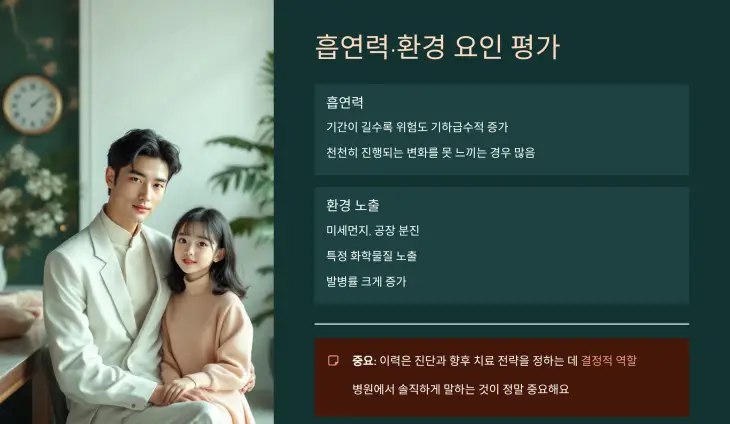 COPD는 생활 습관과 환경 영향이 정말 크기 때문에 의료진은 흡연력과 직업 환경까지 꼼꼼히 확인합니다. 흡연 기간이 길수록 위험도가 기하급수적으로 올라가는 건 이미 여러 연구에서 입증되어 있어요.