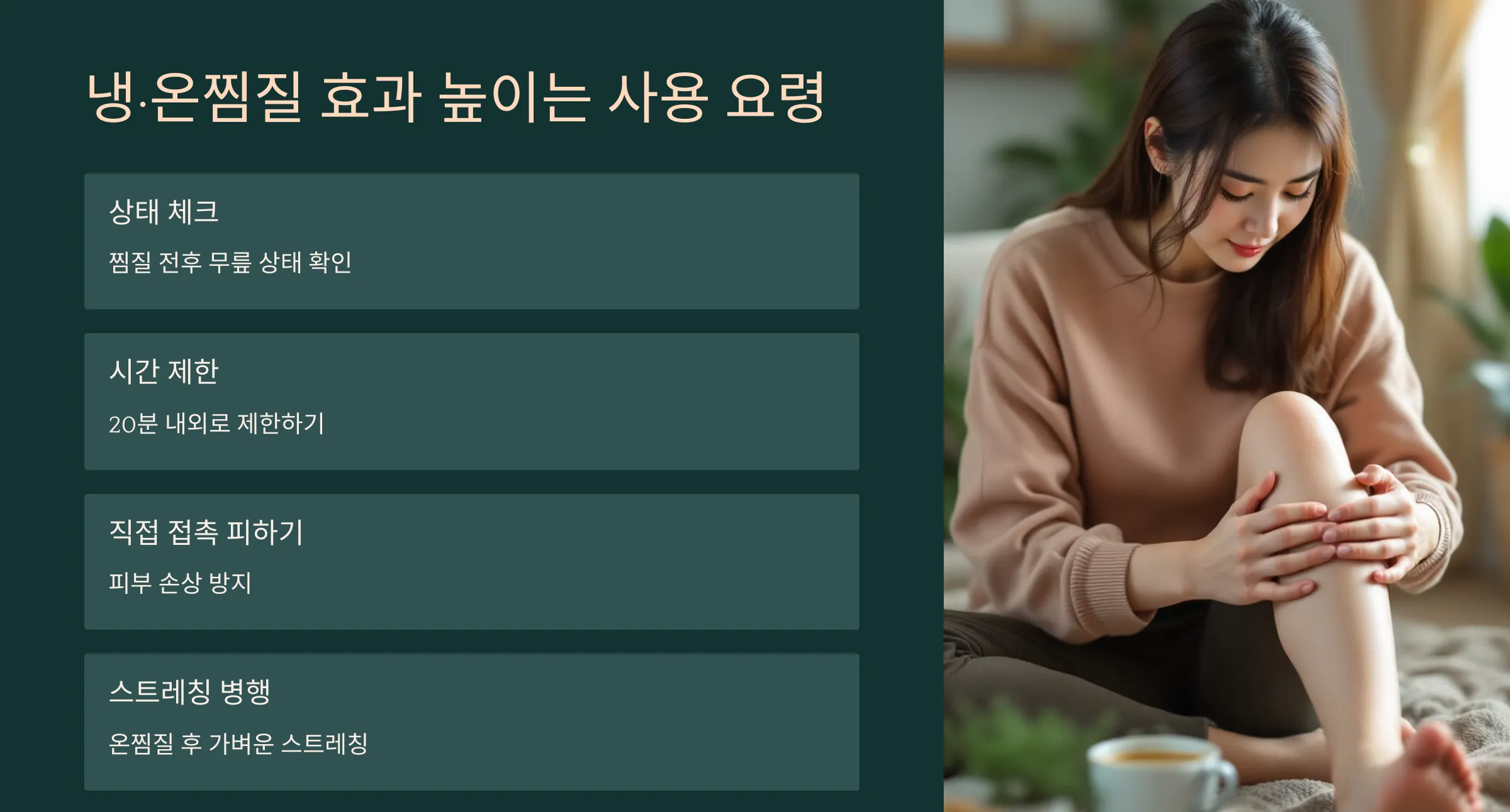 - 찜질 전후로 무릎 상태를 체크하세요 (열감, 붓기 등)