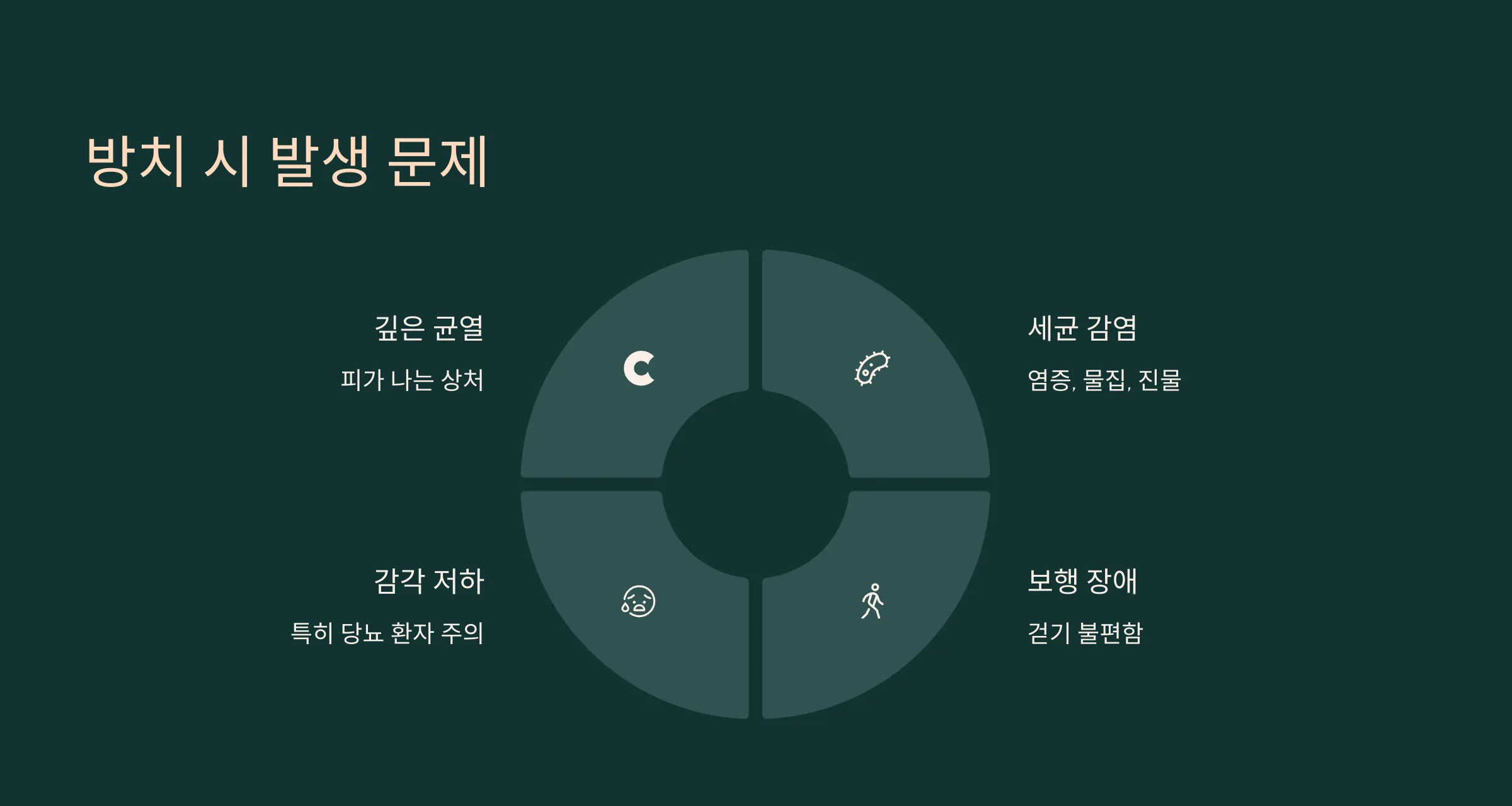 - 감각 저하 (특히 당뇨 환자 주의)