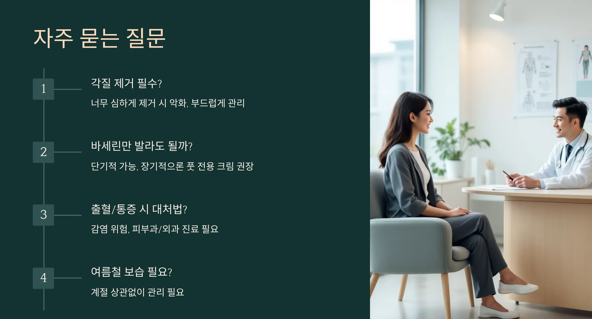A. 아니요! 너무 심하게 제거하면 오히려 상처가 생겨 더 악화될 수 있어요. 부드럽게 관리하세요.