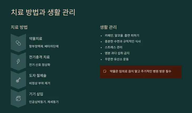 - 약물치료: 항부정맥제, 베타차단제, 항응고제 등