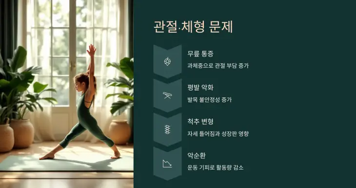 아이들의 뼈는 아직 성장 중이라 체중이 과다하면 관절에 무리가 갑니다. 무릎 통증, 발목 불안정, 평발 악화, 척추 변형 등이 흔히 동반될 수 있어요.