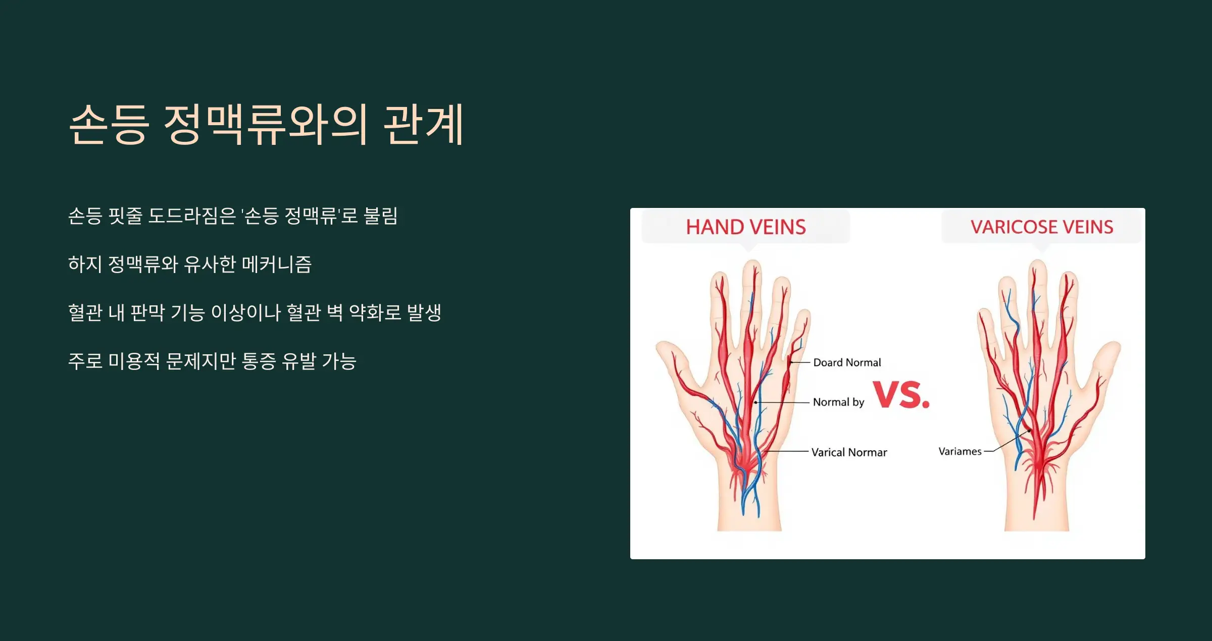 손등 핏줄이 도드라지는 현상은 '손등 정맥류'로 불리며, 하지 정맥류와 유사한 메커니즘을 가집니다. 이는 혈관 내 판막 기능 이상이나 혈관 벽의 약화로 인해 발생할 수 있으며, 주로 미용적인 문제로 간주되지만, 드물게 통증이나 불편함을 유발할 수 있습니다.