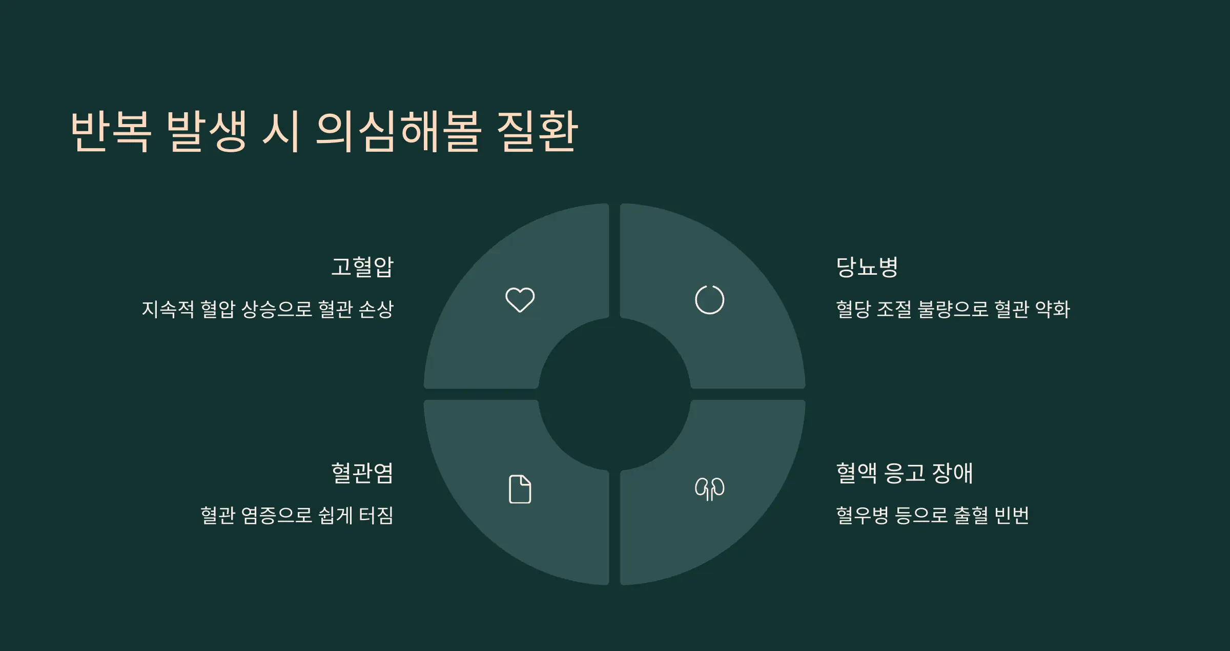 - 혈관 건강 악화: 노화나 당뇨병 등으로 혈관이 약해지면 쉽게 터질 수 있습니다.