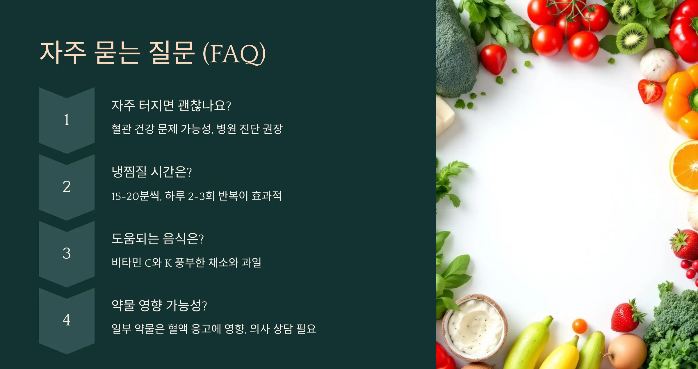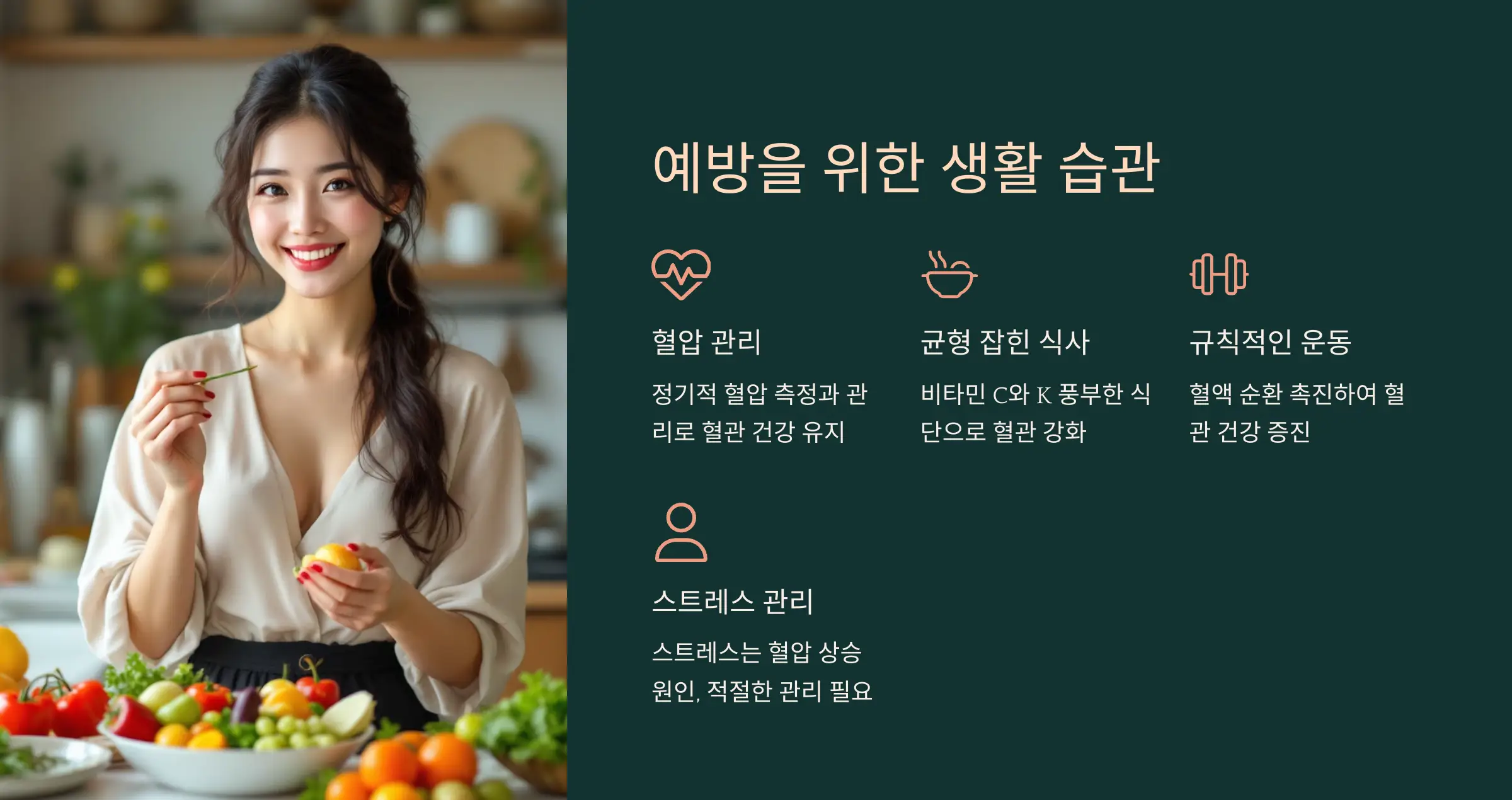 - 균형 잡힌 식사: 비타민 C와 K가 풍부한 식단은 혈관 강화에 도움을 줍니다.
