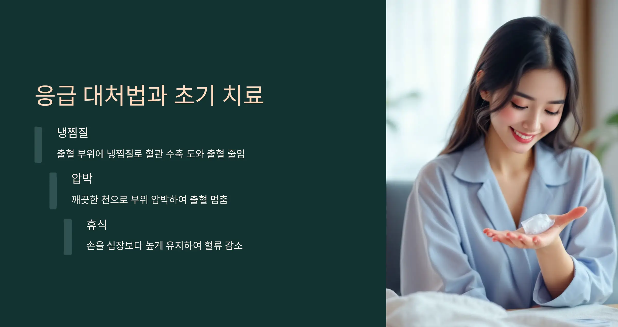 - 냉찜질: 출혈 부위에 냉찜질을 하면 혈관 수축을 도와 출혈을 줄일 수 있습니다.