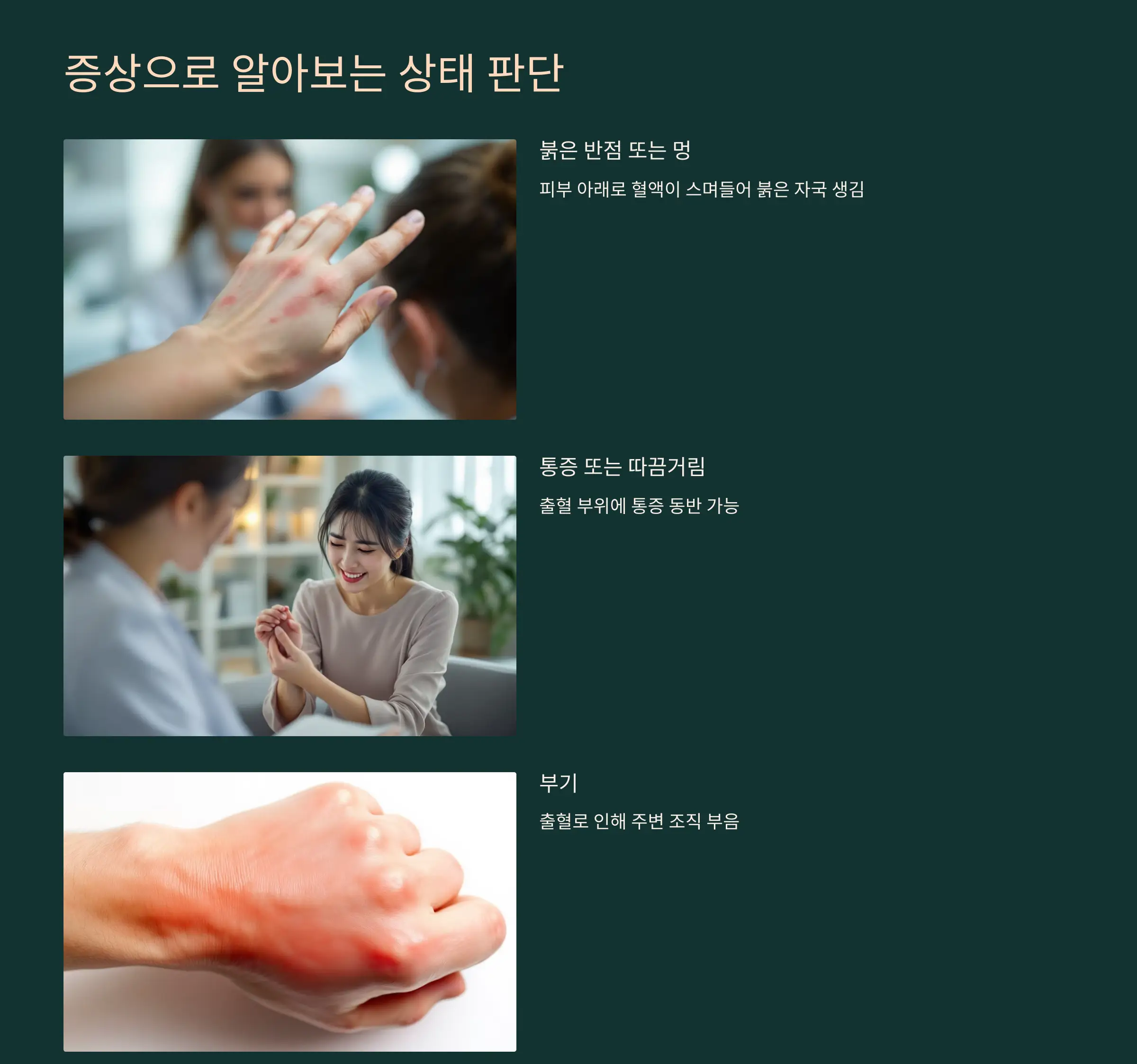 - 붉은 반점 또는 멍: 피부 아래로 혈액이 스며들어 붉은 자국이 생깁니다.