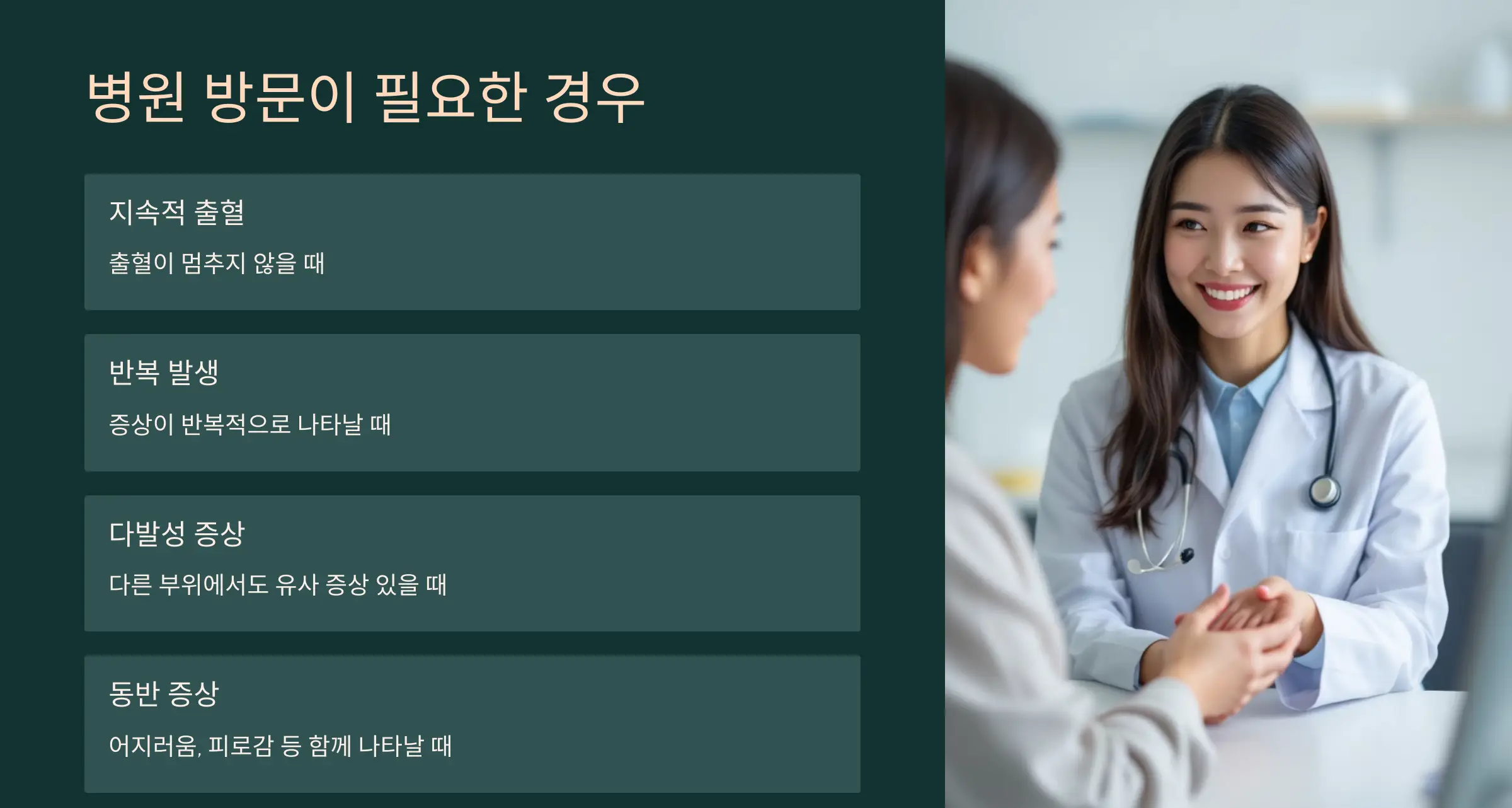 이러한 증상이 반복되거나 다른 부위에서도 발생한다면, 전신적인 문제를 의심해봐야 합니다.