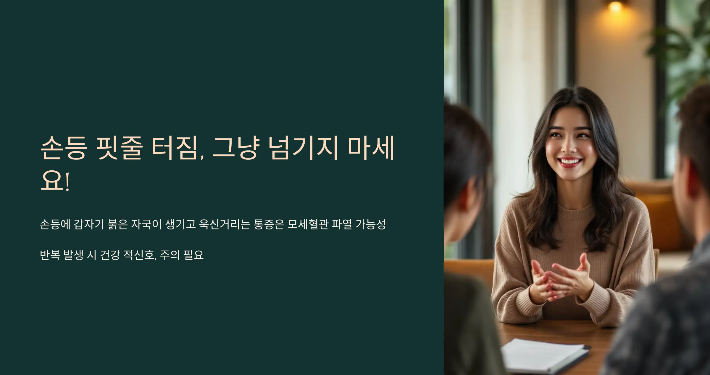 손등에 갑자기 붉은 자국이 생기고, 욱신거리는 통증이 느껴진다면? 단순한 멍으로 치부하기 쉽지만, 이는 모세혈관 파열로 인한 출혈일 수 있습니다. 특히 반복적으로 발생한다면 건강의 적신호일 수 있으니 주의가 필요합니다.