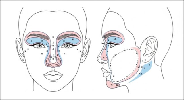 안면 다한증 보톡스 주사 부위를 표시한 의료 다이어그램