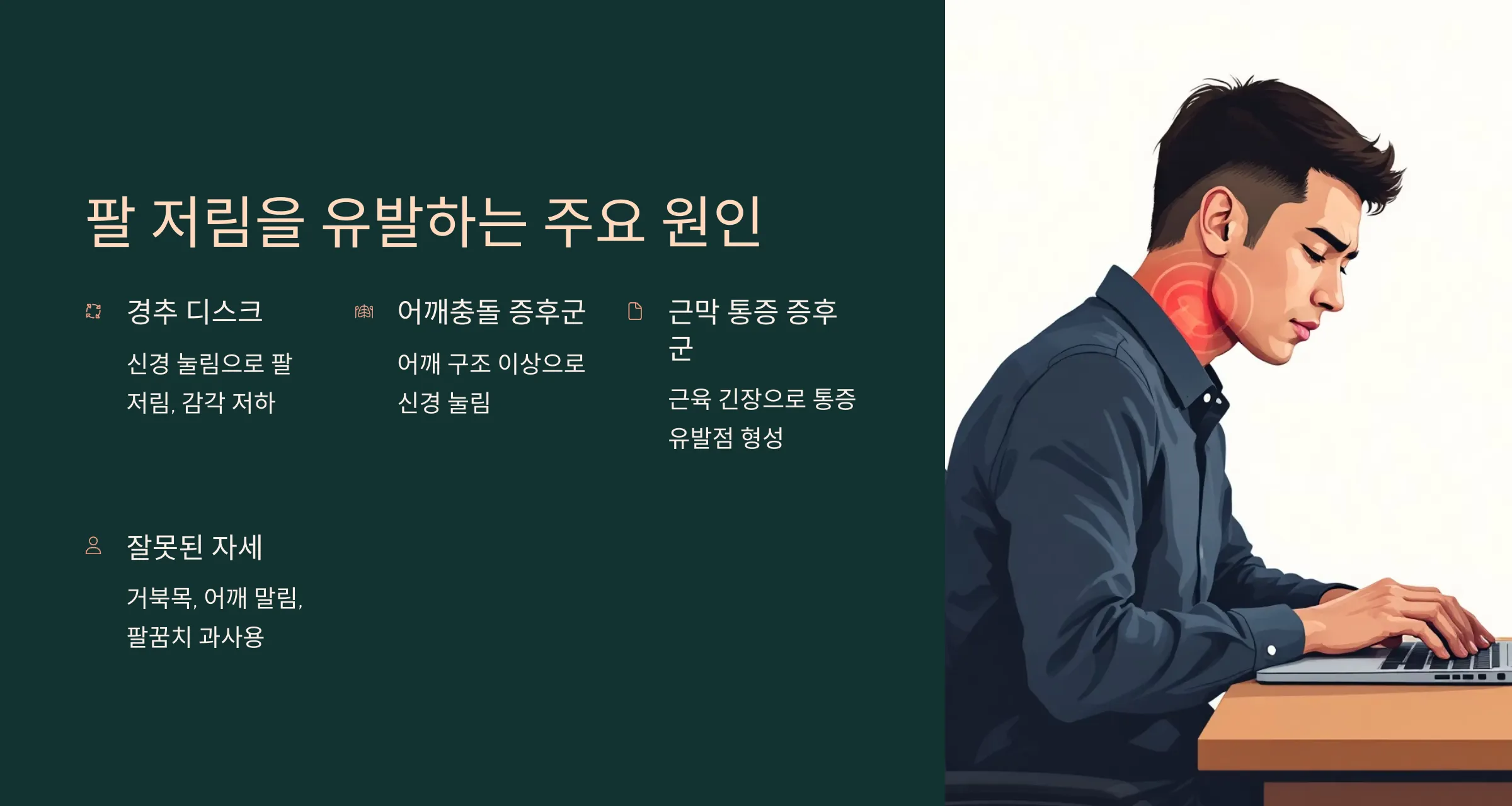 - ✅ 혈액순환 장애: 팔로 가는 혈류 감소로 저림 증상