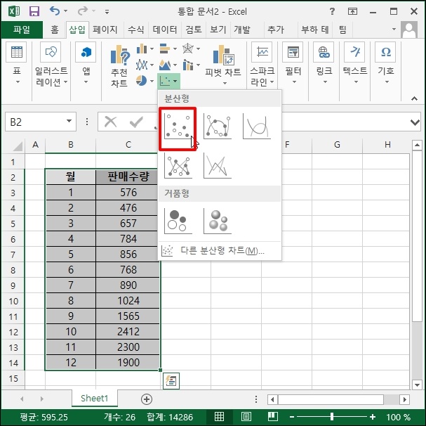 서브 메뉴 중 여러 그래프 아이콘이 보이는데요. 분산형을 클릭합니다.
