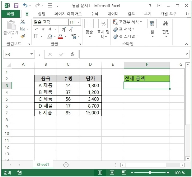 Excel 파일에서 품목의 단가와 수량을 지정했습니다. 오른쪽의 총액에 상품의 수량과 단가를 요약하는 기능을 사용합니다.