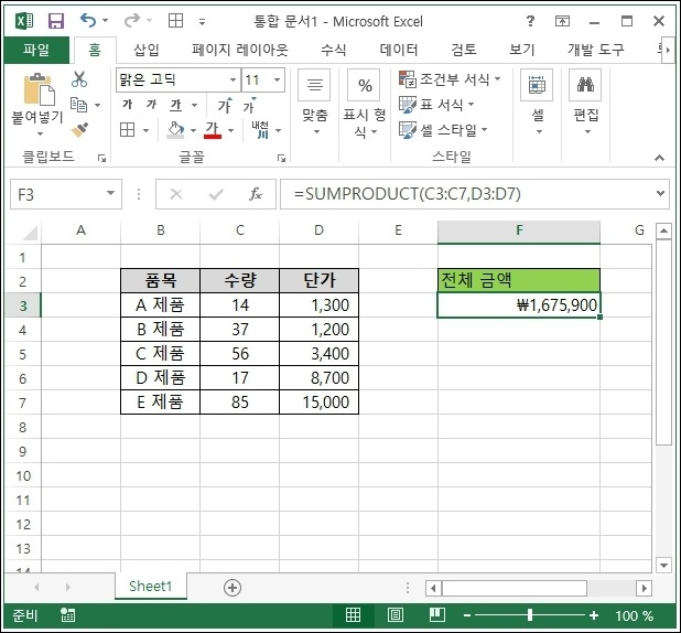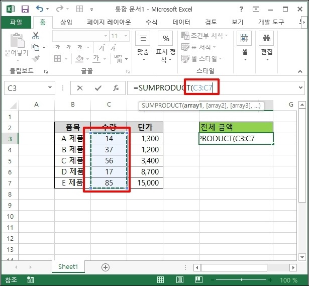 우리가 사용하는 함수는 sumproduct입니다.