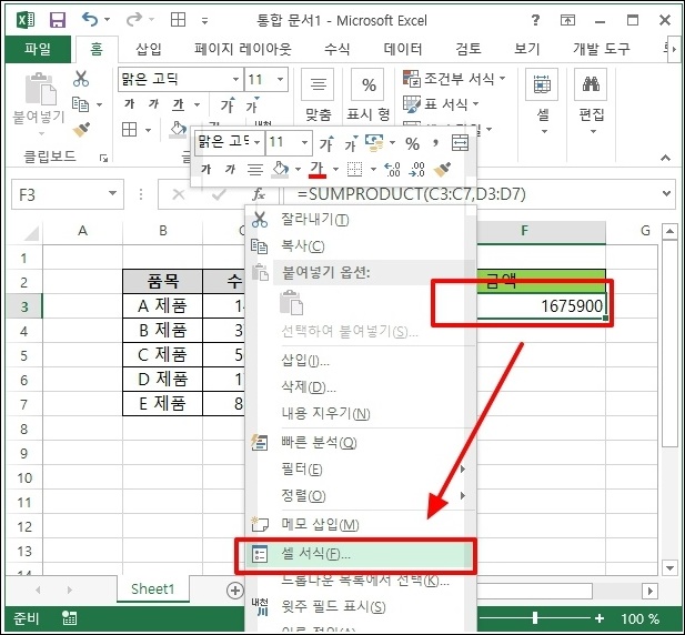 결괏값이 나왔는데요. 숫자를 통화처럼 보이면 좋지 않을까요? 통화로 변경해보겠습니다. 셀을 마우스 오른쪽 버튼으로 클릭하고 "셀 서식"을 선택합니다.