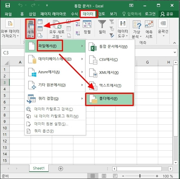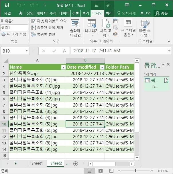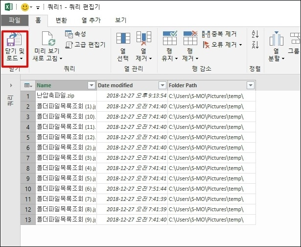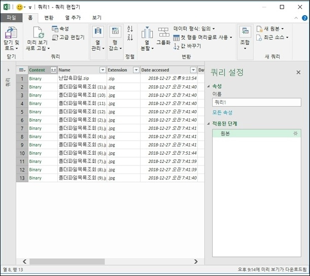 쿼리 편집기 창을 띄우고 폴더의 파일 목록을 쿼리합니다.