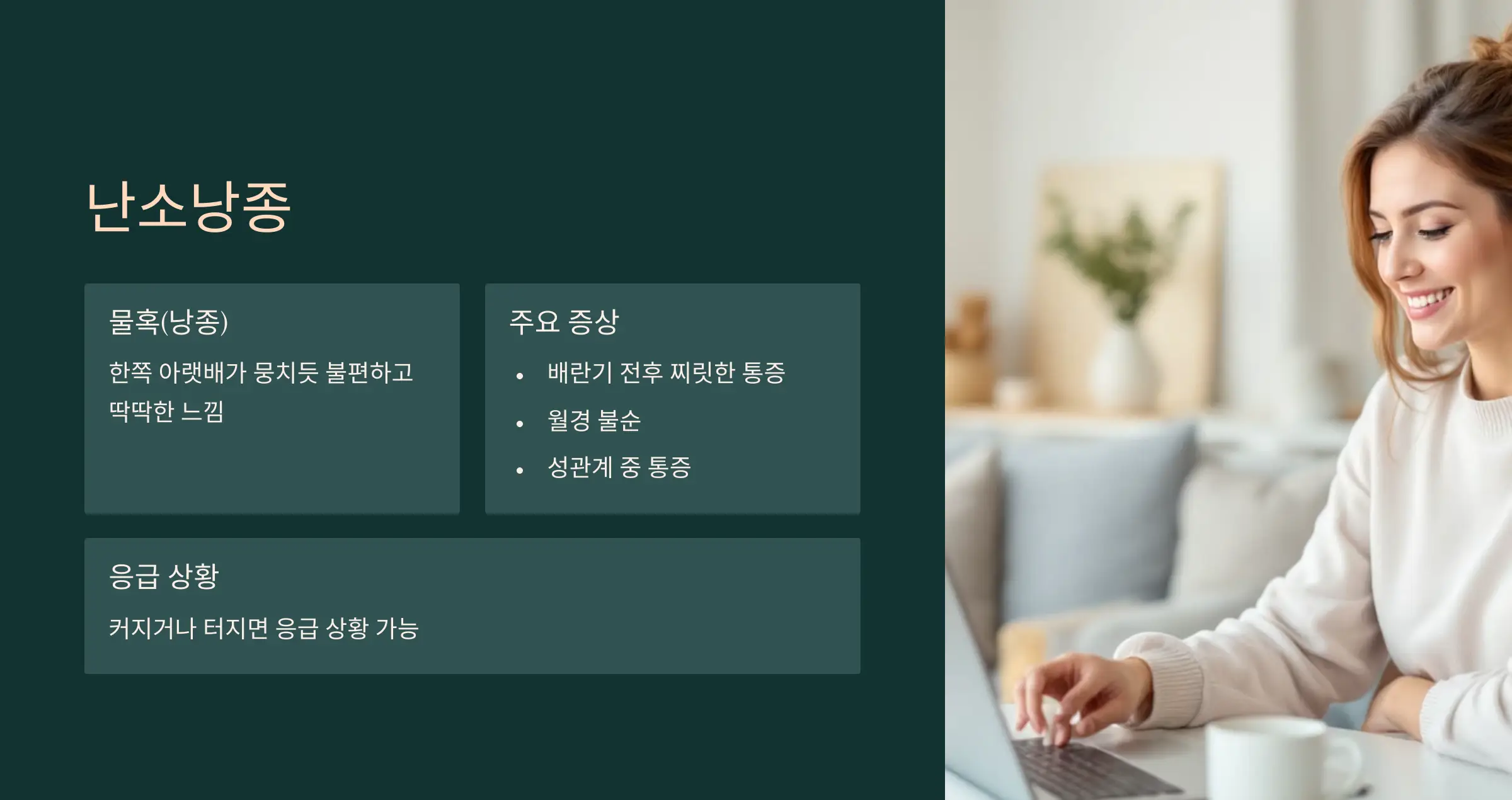 난소에 물혹(낭종)이 생기면 한쪽 아랫배가 뭉치듯 불편하고, 딱딱한 느낌을 줄 수 있어요.