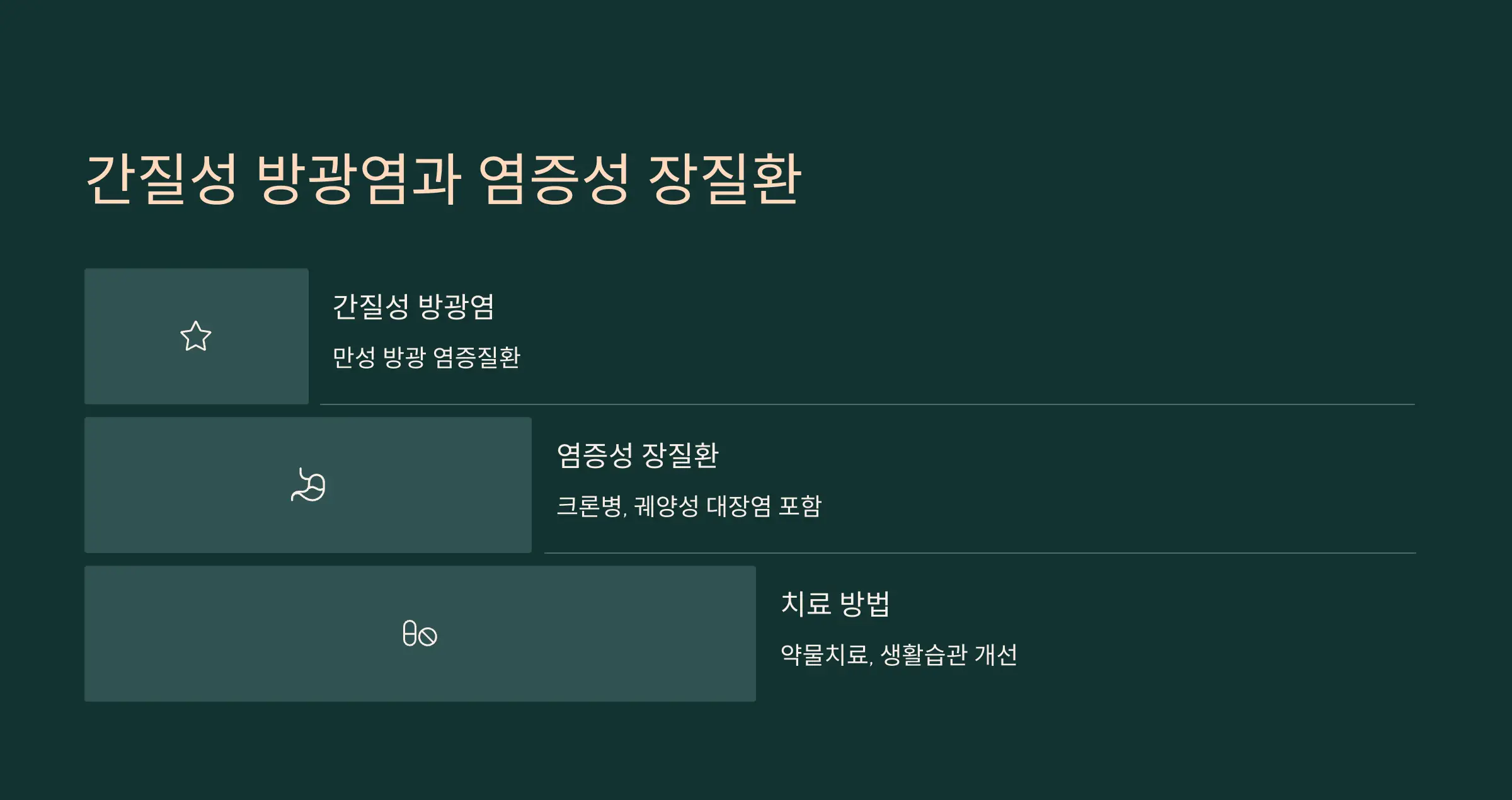 염증성 장질환은 크론병과 궤양성 대장염 등을 포함하며, 복통이나 설사, 체중 감소 등의 증상이 나타날 수 있어요.