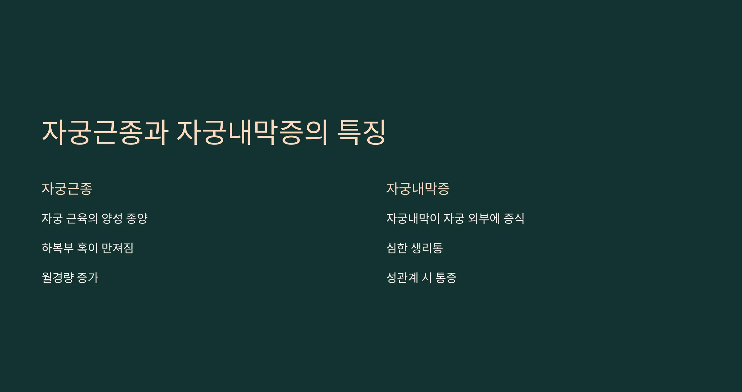 자궁내막증은 자궁내막 조직이 자궁 이외의 조직에 부착하여 증식하는 질환으로, 생리통이 심하거나 성관계 시 통증이 있을 수 있어요.