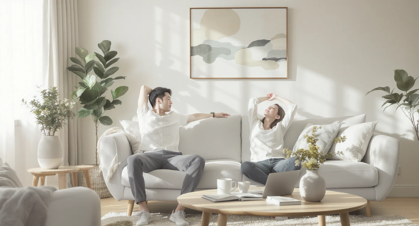 규칙적인 수면과 스트레칭으로 두통을 예방하는 건강한 한국인 라이프스타일 이미지