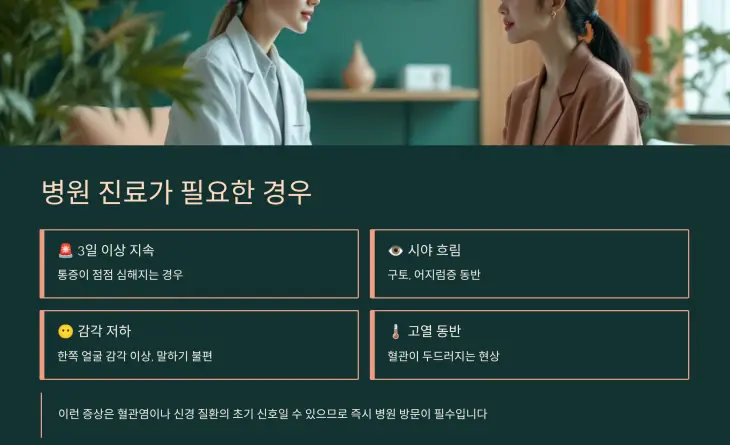 이런 증상은 단순한 근육 긴장이 아닌, 혈관염이나 신경 질환의 초기 신호일 수 있으므로 병원 방문이 필수입니다.