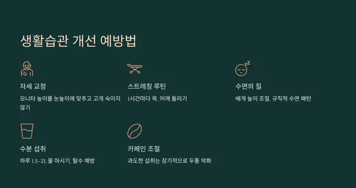규칙적인 스트레칭, 충분한 수면, 그리고 자세 교정이 근본적인 해결책입니다. 또한 물을 자주 마시고 눈을 쉬게 하는 것도 도움이 됩니다.
