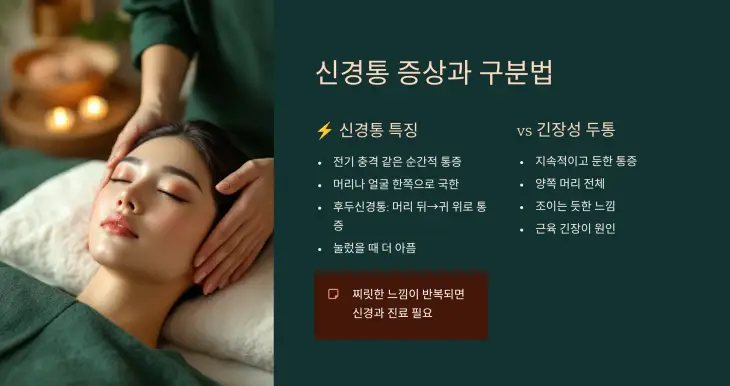 특히 후두신경통은 머리 뒤쪽에서 귀 위로 통증이 이어지며, 눌렀을 때 더 아프게 느껴집니다.