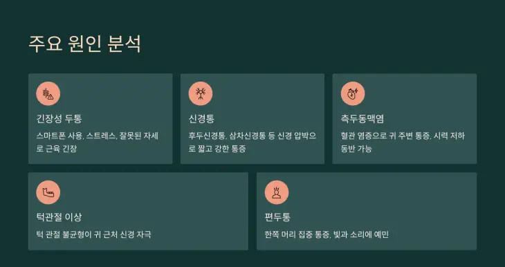 - 치아 문제 또는 턱관절 이상: 턱 관절의 불균형이 귀 근처 신경을 자극해 통증이 머리로 번질 수 있습니다.