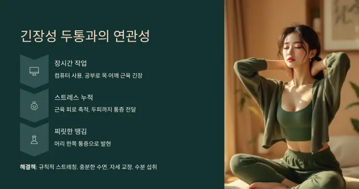 긴장성 두통은 가장 흔한 원인 중 하나입니다. 특히 목과 어깨의 근육 긴장이 두피까지 이어져 통증을 유발합니다.