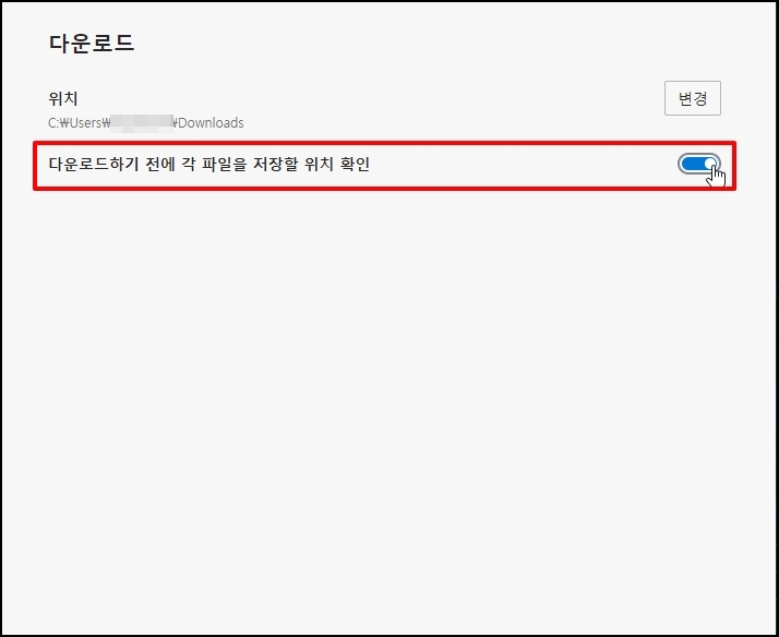 [다운로드 하기전에 각 파일을 저장할 위치 확인]을 [켬]으로 하면