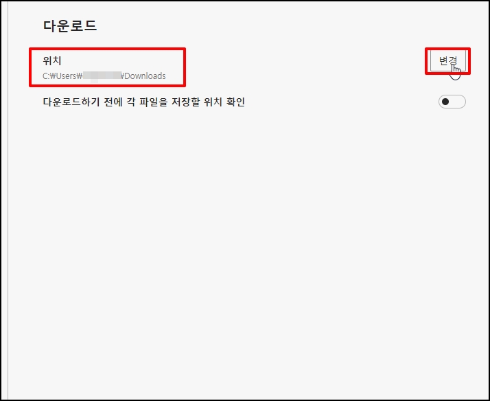 우측 기본 다운로드 폴더 경로가 보입니다. 변경하시려면 우측 [변경] 버튼을 클릭합니다.