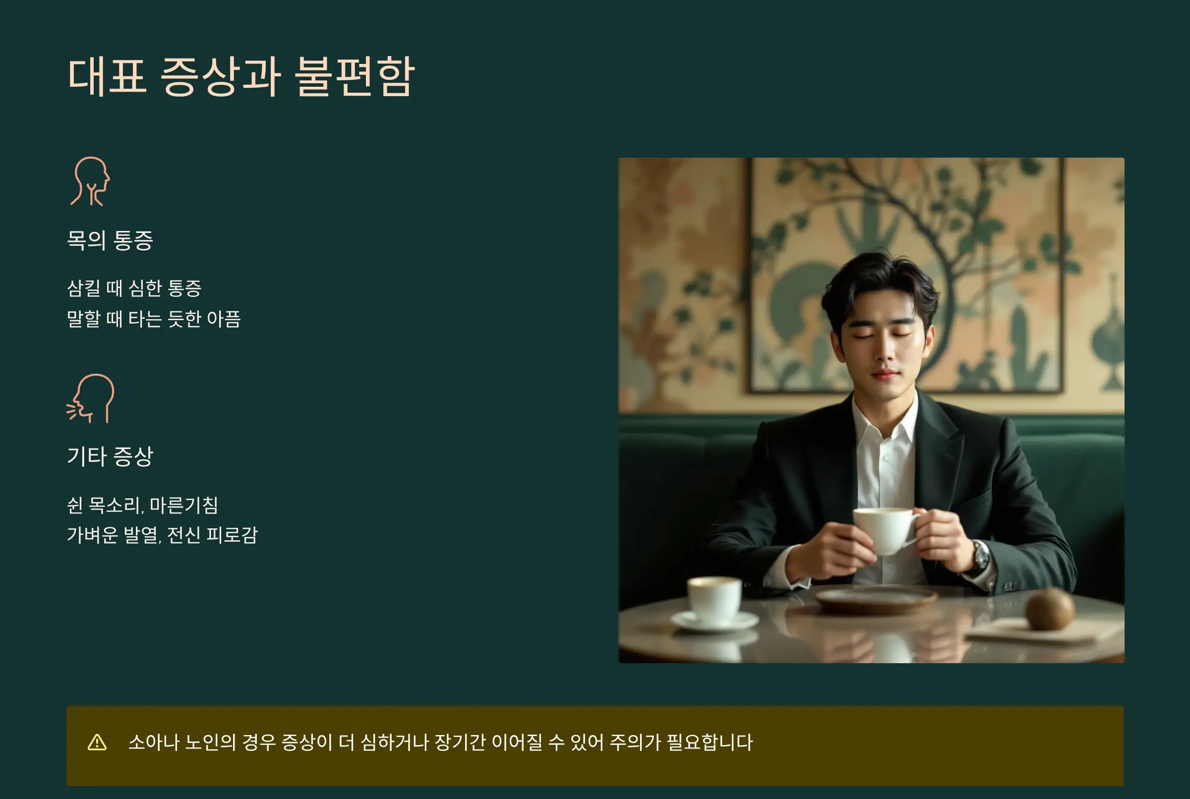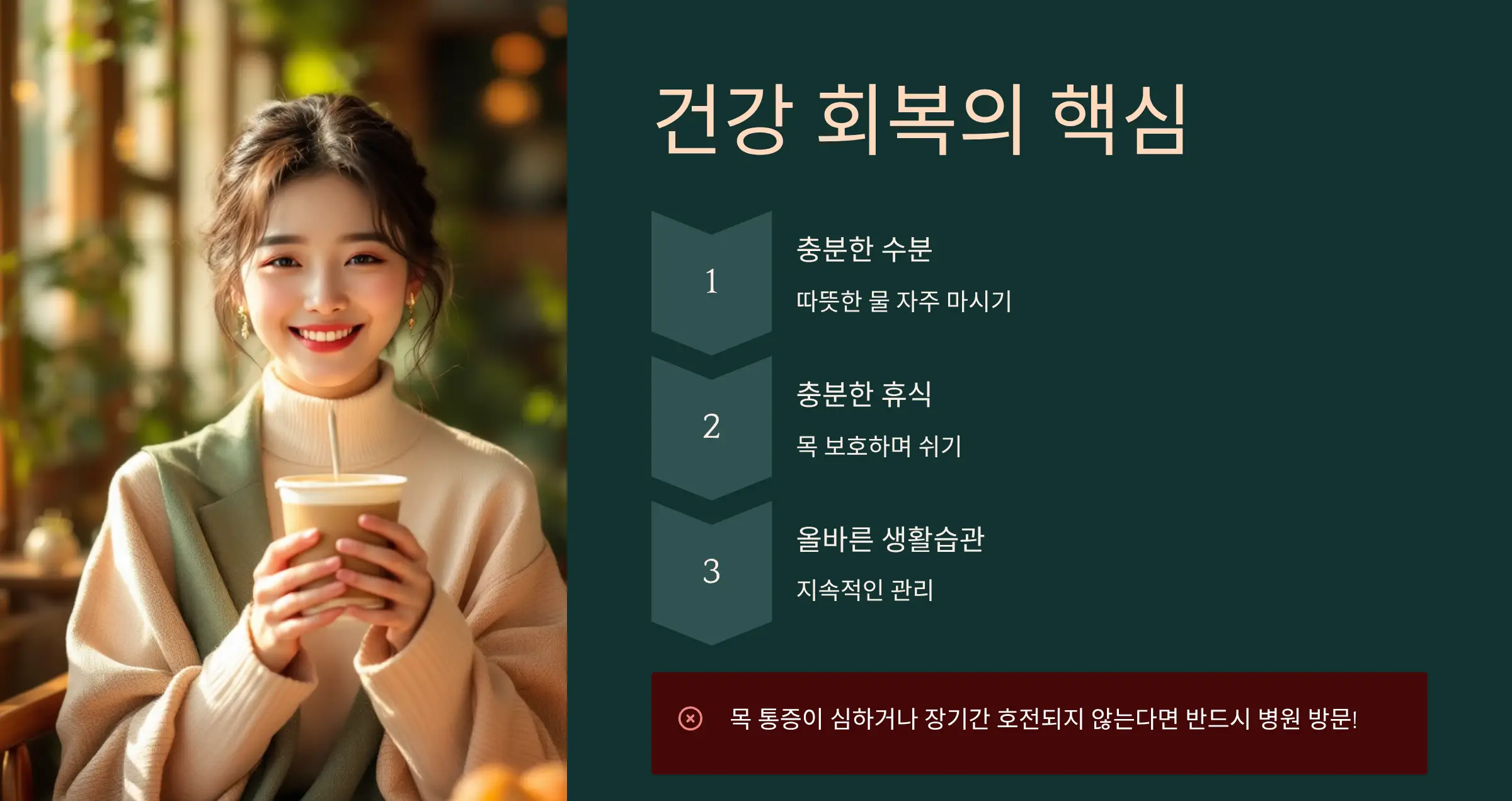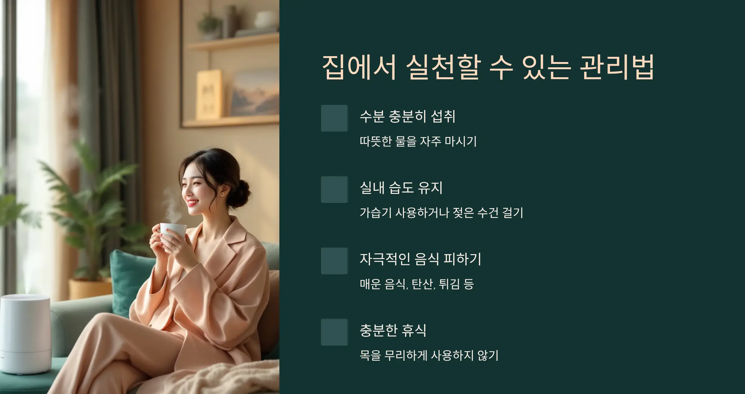 이런 간단한 습관만 지켜도 인후염 증상 완화에 큰 도움이 됩니다.