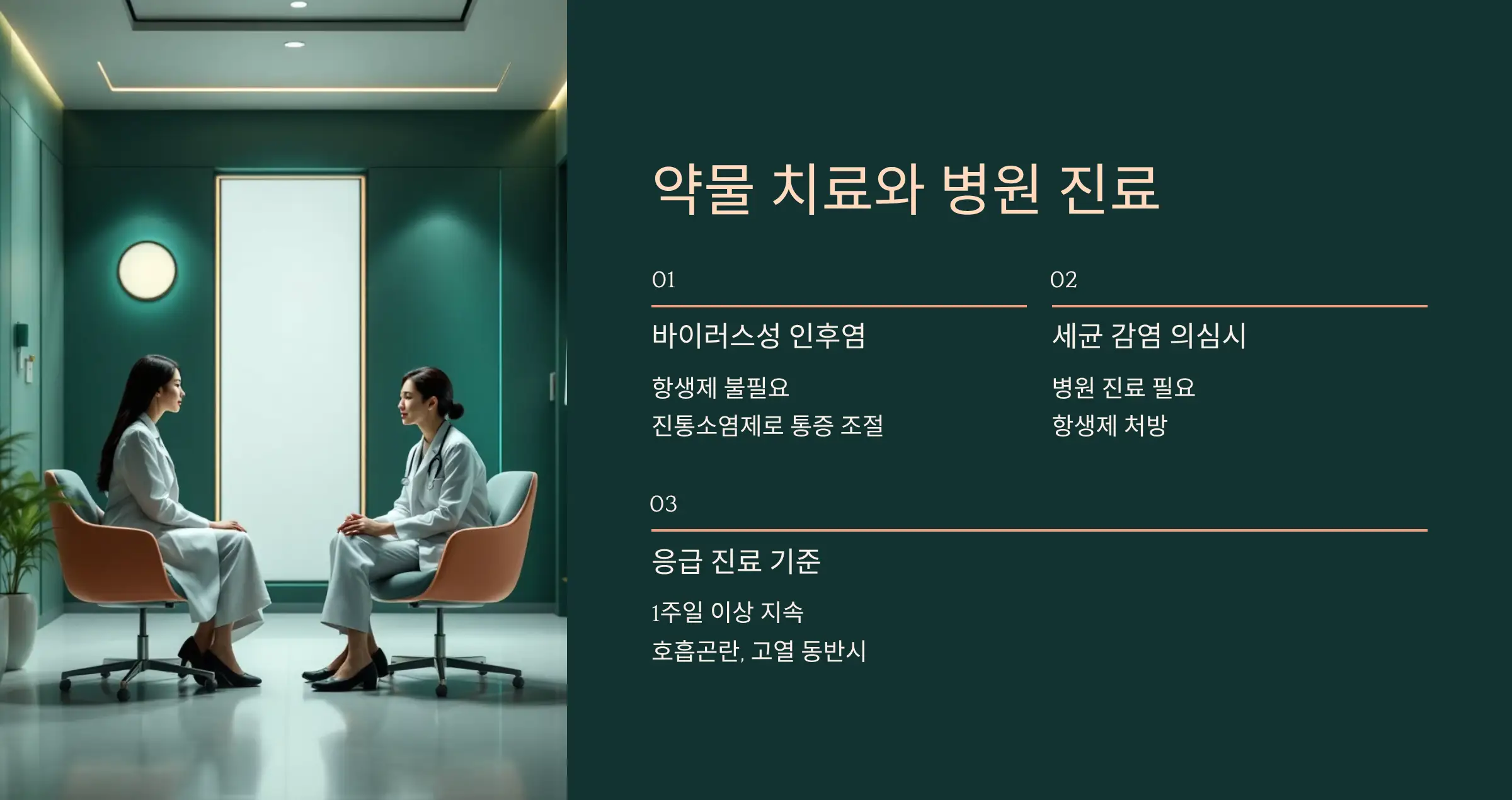 바이러스성 인후염은 대부분 시간이 지나면서 호전되기 때문에 항생제가 필요하지 않습니다. 하지만 통증 조절을 위해 진통소염제나 해열제를 복용할 수 있으며, 증상이 심한 경우 병원 진료를 통해 약물 처방을 받는 것이 좋습니다. 세균 감염이 의심될 경우에는 항생제가 처방되며, 증상이 1주일 이상 지속되거나 호흡 곤란, 고열이 동반된다면 반드시 병원 진료가 필요합니다.