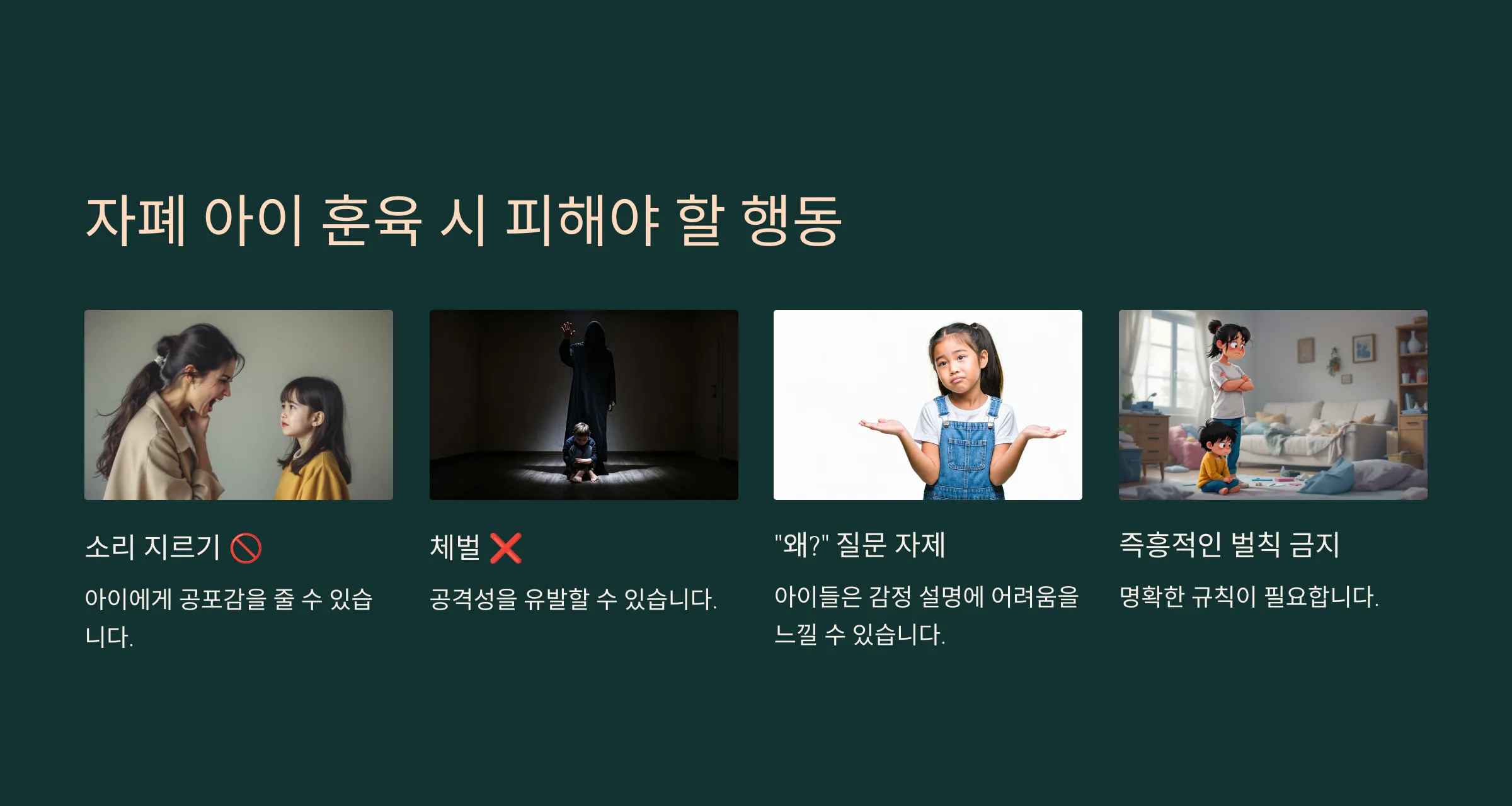 따라서 일반적인 혼내는 방식(고함, 체벌, 감정적인 훈육)은 오히려 부작용을 낳을 수 있습니다.