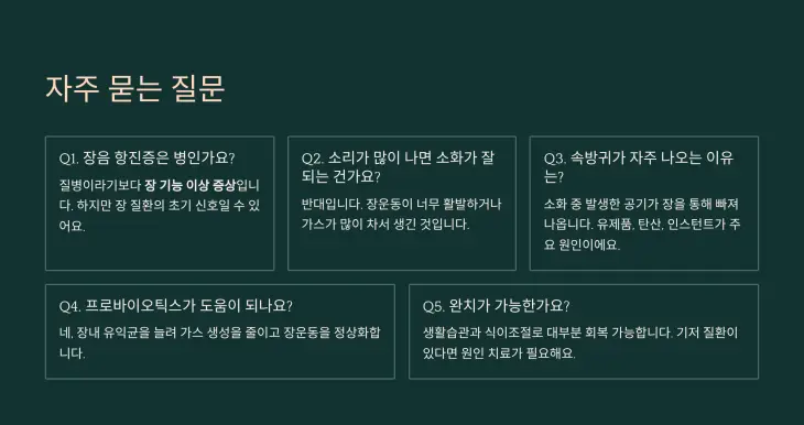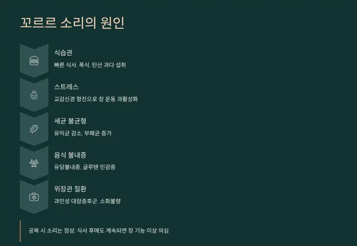 💡 특히 공복 시 꼬르륵 소리가 심하다면 단순 생리적 현상이지만, 식사 후에도 계속된다면 장 기능 이상을 의심해야 합니다.