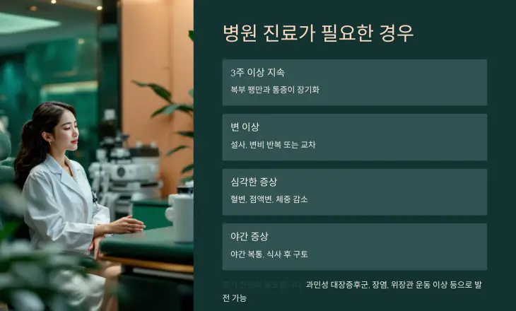 의사는 필요 시 복부초음파, 대장내시경, 호흡검사(SIBO 검사) 등을 통해 정확한 원인을 진단합니다.