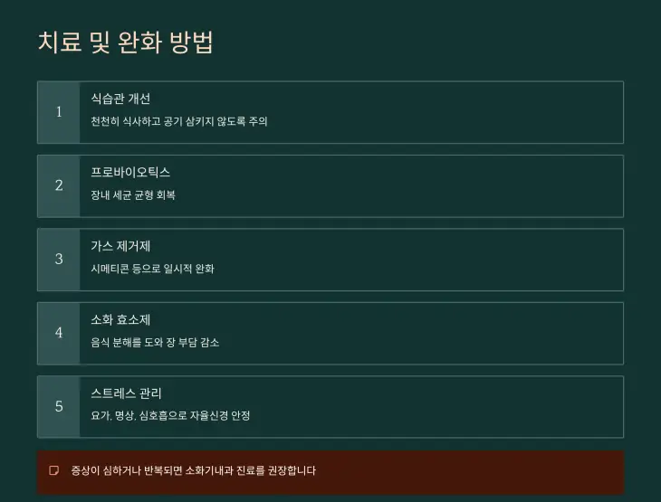 - 식습관 개선: 천천히 식사하고, 공기를 삼키지 않도록 주의
