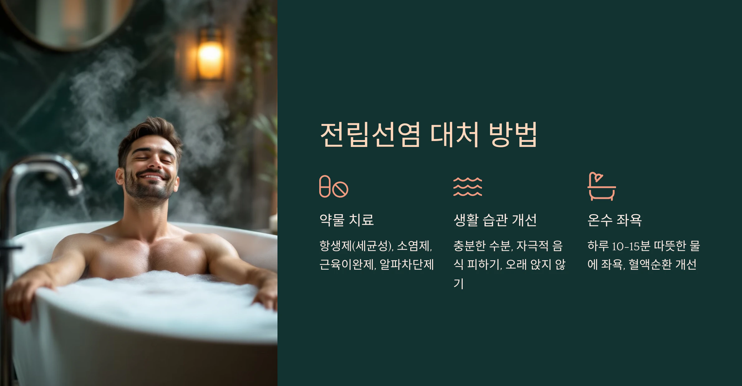 📌 하루 10~15분 정도 따뜻한 물에 좌욕을 하면 전립선 주변 혈액순환이 좋아지고 통증이 완화될 수 있어요.