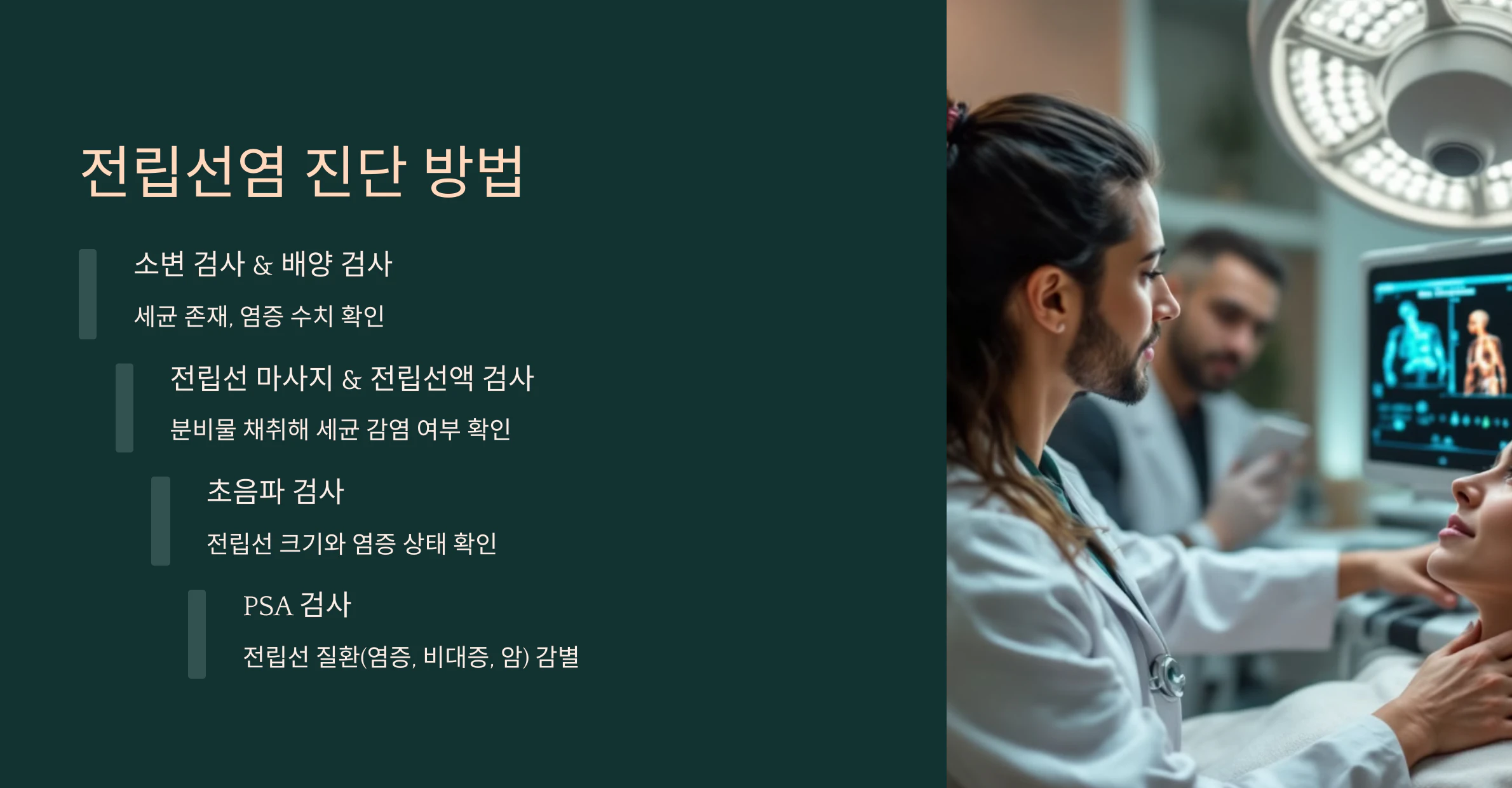 전립선염은 증상만으로 정확히 판단하기 어려우므로, 병원에서 다양한 검사를 통해 진단하게 돼요.